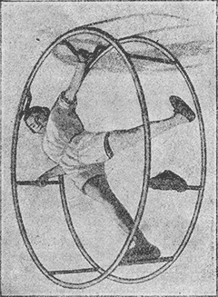 Новый гимнастический аппарат, изображенный здесь, теперь очень распространен в Европе. Гимнаст катится в колесе, состоящем из двух обручей, соединенных железными перекладинами, держась руками за изогнутые поручни. Ноги и голова его плотно закреплены в особого рода зажимах. Упражнения на таком аппарате очень пригодны, как тренировка для будущих авиаторов.