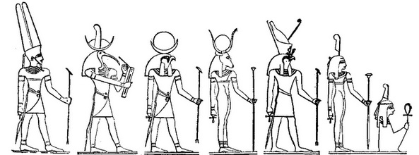 Египетские боги (слева направо): Амон-Ра, Тот, Хонсу, Хатор, Тум, Маат, Нейт, Анубис, Геб, Ра, Нейт, СохметОдно и то же деяние — сотворение мира, например, или сотворение людей — в каждом крупном городе приписывалось разным богам. Весь Египет чтил и любил доброго бога Осириса — и одновременно почитался его убийца, бог зла Сет; имена в честь Сета носили фараоны; и — опять же одновременно — Сета проклинали. В одном религиозном тексте говорится, что бог-крокодил Себек — враг солнечного бога Ра, в другом — что друг и защитник. Совершенно по-разному описывается в разных текстах Загробный Мир… И вообще — о любом природном явлении одновременно существовало множество разных представлений, которые самым непостижимым образом друг другу противоречили. Так, небо изображалось и в виде коровы, и в виде крыльев коршуна, и в виде реки — небесного Нила, и в виде женщины — небесной богини Нут. С нашей точки зрения, такое нагромождение противоречий, конечно, не укладывается ни в какие логические рамки и попросту идет здравому смыслу наперекор. Именно эти противоречия и делают египетскую мифологию столь трудной для понимания, именно из-за них она не получила такого широкого распространения, как мифология Древней Греции. Объяснить, из-за чего эти противоречия возникли, сравнительно нетрудно. В разных областях и городах страны складывались разные варианты одних и тех же легенд, которые, естественно, во многом не совпадали. Сказания передавались из уст в уста, переписывались с папируса на папирус; раз от разу все больше искажался первоначальный смысл текста, добавлялось что-то новое, забывалось старое, все большим становилось несоответствие между разными представлениями об одном боге. Наконец, как в любом фольклоре, сказания смешались и переплелись. Труднее понять, каким образом беспорядочное, казалось бы, нагромождение исключающих друг друга представлений могло сложиться в единую, цельную картину. Ведь если в наши дни человек из двух разных источников получит два противоречивых известия, он немедленно сделает вывод, что какое-то из двух известий (а может быть, и оба) не соответствует истине. Нельзя одновременно верить, что вчера в Москве был дождь и что его вчера в Москве не было: одно утверждение автоматически исключает другое. Как же в сознании египтян одновременно уживались четыре, пять, шесть и больше взаимоисключающих представлений об одном боге? Как они могли верить сразу десяткам противоречивых легенд? Попытаемся в этом разобраться. К сожалению, в наши дни большинство людей считает, что древние египтяне изображали, например, бога солнца Ра в виде человека с головой сокола, а небо — в виде реки, коровы, крыльев птицы и богини-женщины потому, что были наивны, не обладали достаточными знаниями о природе, об окружающем мире; и, чтобы хоть как-то объяснить непонятные для них явления — гром, ветер, закаты и восходы солнца, движение звезд, смену времен года, — они выдумали могущественного бога Ра, который и движет солнце по небу. На самом же деле такое простое, само собой напрашивающееся объяснение слишком поверхностно и содержит лишь очень малую долю истины. Прежде всего, никто из египтян не понимал изображение солнечного бога Ра буквально; никто не верил, что где-то на небесах действительно живет такое существо — человек с соколиной головой. Нет, из