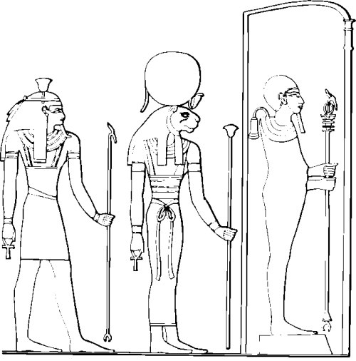 Верховная триада богов города Хет-Ка-Пта (Мемфиса). Справа налево: Птах, его жена — богиня-львица Сохмет и их сын — бог растительности Нефертум с цветком лотоса на голове. В правых руках у Сохмет и Нефертума иероглифы «анх» — «жизнь»В древнейшей столице Египта городе Хет-Ка-Пта[8] творцом мира считался бог Птах (или Пта), покровитель искусств и ремесел. Птах создал сам себя, затем создал Атума, а уже Атум творил мир, действуя «согласно воле Птаха». Птах наделил богов могуществом, «вдохнул в людей жизнь», дал людям законы и письменность, сообщил им все магические заклинания, научил их поклоняться богам, орошать поля, строить дома, высекать статуи. В городе Хемену (в поздней коптской огласовке — Шмуну, по-гречески — Гермопо́ль) провозглашалось иноеучение: в первозданную тьму Хаоса влетела белая птица Великий Гоготун. Она снесла яйцо, в котором был свет. Этот свет и дал начало жизни. Самое замечательное, что при таком обилии противоречащих друг другу учений не было ни одного учения, вера в которое считалась бы обязательной. Понятий «ересь», «еретик» не существовало, и никто не подвергался преследованиям со стороны жречества за «ложную, неправильную веру». Даже одна и та же легенда о сотворении мира могла существовать сразу в нескольких вариантах. Так, в Иуну почиталась мифическая птица Бену (которую греки отождествляли с фениксом). В начале творения Бену летал над водами Нуна и на холме Бен-Бен свил гнездо. Бену и стал прародителем жизни.