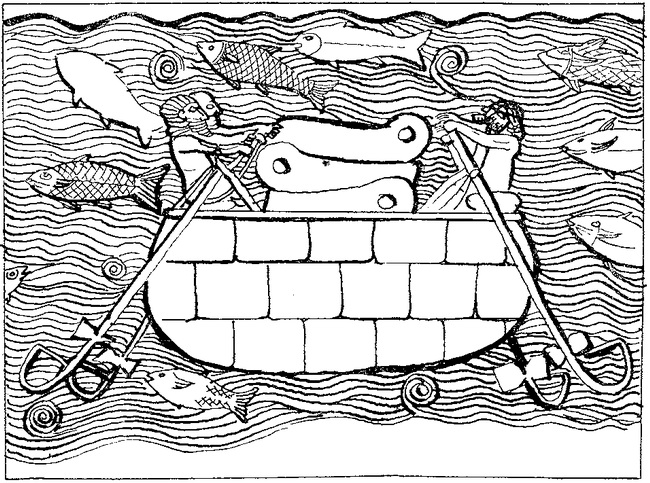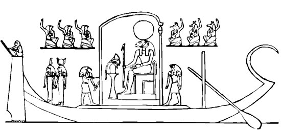 Ладья Вечности. В шатре на троне восседает Амон-Ра, изображенный с головой овна. У подножия трона — жертвенник и лотос; перед троном — Тот, позади — Гор; на носу Ладьи — Маат и Хатхор. Наверху — духи столиц Верховья (с волчьими головами) и Низовья (с головами соколов)Ра, как и надлежало этому великому богу, восседал в шатре, на золоченом троне, украшенном искусной резьбой. У трона на камышовой циновке, скрестив ноги, сидел бог-писец Тот. Он держал развернутый папирусный свиток, а по правую руку бога были разложены приспособления для письма — дощечка с красками и несколько тростинок. Посреди Ладьи, разливая вокруг сияние, покоилось солнце. Вся свита владыки была здесь. На носу Ладьи, гордо вскинув головы, стояли Маат и Хатхор. Головной убор Маат украшало пушистое перо — символ справедливости: Маат была богиней справедливых законов и мудрого миропорядка, которому подчинялись все явления природы — и разливы Нила, и смена времен года, и движение созвездий на небесах. Зорко глядя вперед, Маат следила за соблюдением законов. Ей помогала Хатхор. Завидев на пути Ладьи врагов, она тут же превращала их в пепел лучами своего урея. Возле трона с копьем в руке стоял сын Ра, бесстрашный Гор Бехдетский, готовый в любой момент по приказу отца ринуться в бой и сокрушить злых демонов. Но небо было чистым. Не хмурились у горизонта тучи, нигде даже не было видно ни единого облачка. «Сегодня плавание будет спокойным, — подумал Ра. — Все исчадия зла — крокодилы, змеи и гиппопотамы — попрятались в пучину Нила и залечивают раны после вчерашней битвы». Вчера богам пришлось выдержать кровопролитный бой. Крокодилы, гиппопотамы и ползучие ядовитые гады застали врасплох дружину небесных корабельщиков. Они подкараулили Ладью у самой пещеры, и, как только она выплыла на небо, злодеи накинулись на нее со всех сторон и вцепились в борта, стремясь перевернуть. Один из крокодилов разинул пасть и хотел уже было проглотить солнце. Если бы ему это удалось, наступило бы солнечное затмение. Но Гор Бехдетский пронзил зубастое чудище копьем, убив наповал. И все-таки войско злодеев было слишком многочисленно, поэтому сражение затянулось, и на земле разгулялось ненастье: выл-бушевал ураган, кудлатые тучи закрыли небо над всей Дельтой и метали раскаленные молнии. Исход битвы решился только под вечер. Демоны раскачали Ладью, прогрызли зубами днище, так что в пробоину стала затекать вода. Но боги, собравшись с силами, пошли в атаку — и вражьи ряды дрогнули. Истекая кровью, ползучие твари отступили и спрятались на дне Нила. Только это их и спасло от поголовного истребления. В Та-Кемет снова установилась ясная погода.