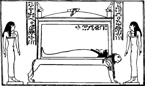 Исида и Нефтида оплакивают Осириса, покоящегося на погребальном ложеОн раскидал ветки, прикрывавшие сундук. В этот момент луна вышла из-за облака, и в ее серебристых лучах полыхнули и заискрились драгоценные камни. Крик изумления вырвался у Сета. — Сокровища! — воскликнул он и алчно потер руки. — Воистину сегодня у меня самая удачная охота, какую только можно себе представить! Он выхватил меч, перерубил ремни, которыми был обвязан сундук, откинул крышку. И попятился. Некоторое время он остолбенело хлопал своими кроваво-красными глазами. Потом зрачки его вспыхнули, длинные уши задергались, красная грива встала дыбом. — А! Здравствуй, мой дорогой, мой любимый братец! — воскликнул он и разразился хохотом, от которого попрятались в норы ночные звери и шарахнулась пролетавшая поблизости сова. — Вот, оказывается, куда тебя прибили волны! Сердце мое в печали, я едва не ослеп от слез, оплакивая твою безвременную смерть. О, возлюбленный мой брат! Ты до сих пор не похоронен! Но я похороню тебя по-царски! И, выхватив меч из-за пояса, Сет изрубил тело Осириса на четырнадцать частей и разбросал эти части по всей земле Та-Кемет. — Пусть жрут тебя шакалы! Пусть их желудки станут для тебя гробницей! Пусть умрет в народе всякая память о тебе! — напоследок прорычал он и ушел. А когда Ладья Вечности выплыла на небеса и забрезжило утро, вернулась Исида вместе с Нефтидой и Анубисом. — Здесь был Сет! — Нефтида побледнела. — Смотри, сестра! Это его следы! Богини бросились к сундуку. Он был пуст. Молча оглядела Исида поляну, увидела кровь на траве и все поняла. Ей представилось, как злорадно хохотал Сет, разрубая мечом мертвое тело. Богиня захлопнула сундук и в изнеможении села на него. У нее уже не было сил плакать. Она лишь тихо промолвила: — Скоро у меня родится сын. Он отомстит за смерть отца! — Так пусть же этот день поскорее наступит! — воскликнул Анубис. — Мы должны собрать тело Осириса по частям: я могу их срастить при помощи снадобий и целебных трав. Давайте не будем медлить и отправимся на поиски. Пусть каждый из нас, найдя какую-либо часть, поставит надгробную плиту в том месте. Чем больше будет плит, тем труднее будет Сету найти настоящую могилу. К тому же эти плиты будут напоминать людям, какой добрый бог правил ими раньше и какой злодей царствует теперь. Люди перестанут приносить жертвы Сету и понесут их к надгробиям Осириса. — Сын мой, ты изрек мудрые слова, — растроганно сказала Нефтида. И они отправились на поиски. Анубис обошел пустыню, Нефтида — горы, а Исида смастерила папирусную ладью и плавала в ней по болотам и рекам. С тех пор крокодилы из почтения к великой богине не нападают на рыбаков, плавающих в папирусных челноках. Когда останки Осириса были собраны, Анубис срастил их и смазал труп бога волшебными маслами и снадобьями, предохраняющими от тления. И вот мертвый бог покоился на погребальном ложе. Это была первая мумия на земле. С того дня среди людей и утвердился обычай мумифицировать покойников. Исида и Нефтида стали причитать над мертвым телом: