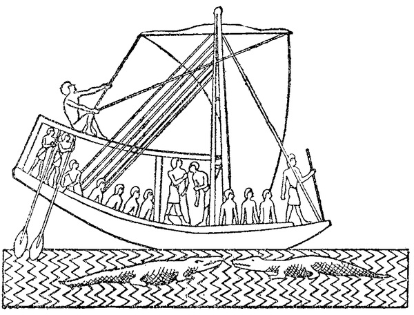 С тех пор как могущественный властелин богов вознесся на небо, в мире все изменилось. Ра уже не летал, как прежде, над землей и не ночевал в священном лотосе. Но солнце все так же сияло днем, гасло вечером и вновь вспыхивало утром. Боги — Ра и его свита — теперь перевозили солнечный диск в Ладье. Эта Ладья называлась «Ладьей Вечности»[17]. Днем она плыла по небесной реке с востока на запад, и солнце освещало землю. Обратный путь — с запада на восток — Ладья проделывала ночью: она плыла под землей через Загробный Мир, и солнце дарило тепло своих лучей мумиям, лежащим в саркофагах. На рассвете Ладья через пещеру в восточных скалах вновь выплывала на небосвод, и все повторялось сызнова — изо дня в день, из года в год, столетие за столетием. Много опасностей подстерегало богов, плывущих в Ладье Вечности, много удивительных приключений переживали они во время путешествия. Вот как проходило это путешествие.Гребцы взмахнули веслами. Ладья Вечности выплыла из пещеры на небо и легко заскользила ввысь, вспенивая воду небесного Нила.