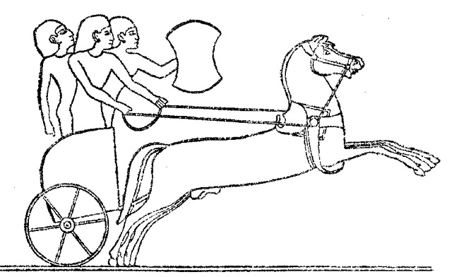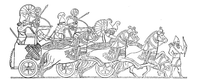 Ассирийкая боевая колесницаИз мужских божеств, относимых в Эбле к числу великих, известен впоследствии исчезнувший из сирийского пантеона Идакул (или Идабал), чтение имени которого и функции разными исследователями определяются по-разному: одни (в том числе П. Маттиэ) считают его супругом Ишкхары, лунным божеством, аналогом аккадского Сина, другие — богом дождя и града, ипостасью Ваала — Хадада. До тех пор пока не была обнаружена в текстах супруга этого божества, его даже считали женским. Четырех богов Эблы Дж. Петтинато относит к числу хурритских. Это Адаммау, Аштаби, чьи имена входят в названия месяцев, Хебат и упоминавшаяся выше Ишкхара. Однако хурритская их атрибуция встретила возражения других исследователей. Так, И. М. Дьяконов отмечает, что хурриты появились в Эбле лишь во II тысячелетии, составив в возрожденной после аккадского разрушения Эбле значительную часть нового населения. Они не могли передать ее доаккадскому пантеону своих богов и сами заимствовали из дохурритского субстрата имена Адаммау, Аштаби и Ишкхары (известной в регионах, где хурритское присутствие не засвидетельствовано); в отношении же Хебат, по мнению ученого, следует говорить о неправильном прочтении имени.