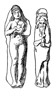 Аккадский бог бури Адад. Фигурка из Вавилона эпохи царя Ассаргадона. Государственный музей. БерлинОтдельные намеки, имеющиеся в заклинаниях, гимнах, описании ритуала, говорят о наличии у народа Эблы собственных мифов, но восстановить сюжеты по этим намекам невозможно. Зато о круге их мифологических пристрастий косвенно можно судить по тем фрагментам шумерских мифов, которые изучались в писцовых школах Эблы. Среди них две обнаруженные в архиве Эблы копии шумерского варианта мифа о потопе, отрывки эпического текста с упоминанием Гильгамеша, три экземпляра гимна Господину неба и земли. Исследователями отмечалось, что сохранившиеся фрагменты шумерских литературных сочинений свидетельствуют об особом интересе к произведениям, связанным с Уруком. Таким образом, несмотря на ограниченность дошедших до нас сведений, религиозная жизнь Эблы вырисовывается с не меньшей ясностью, чем современная ей Шумера и Аккада, хотя и остается немало спорного в отношении субординации и функций отдельных богов пантеона. Прежде всего нет единого мнения в отношении главы пантеона. Дж. Петтинато полагает, что это Даган, божество, почитание которого было широко распространено в западносемитском мире, по крайней мере, начиная с середины III тысячелетия до н. э. О значимости Дагана свидетельствует и ономастический материал. Отсутствие же его имени в списках богов Эблы, по мнению исследователя, «связано с религиозной концепцией табуации имени верховного божества». Дж. Петтинато и вслед за ним многие другие семитологи именно Дагана видят в часто встречающихся определениях типа «Господин», «Господин богов», «Господин страны». П. Маттиэ, напротив, склонен считать верховными богами для периода, предшествовавшего аккадскому вторжению, супружескую пару, в которой мужское божество плодородия типа Дагана или Адада условно фигурирует под именем Куры (соответствие клинописных знаков точному имени бога не установлено) и Барамы, чье имя полностью исчезло в последующей сирийской религиозной традиции. Один из их храмов располагался на скале рядом с дворцом, другой — за городскими стенами. Именно эта пара получала наибольшее количество официально установленных жертв от царя, членов царской семьи, сановников и жрецов. Верховным богом Эблы Куру считал и И. М. Дьяконов. Однако мнение это возобладало сравнительно недавно: еще в конце 80-х гг. тот же П. Маттиэ с ним не был согласен и относил к Куре встречающиеся в ритуальных текстах упоминания «великой богини Эблы» и изображения на печатях женской фигуры, укрощающей львов, считая, что Кура — это великое женское божество плодородия, владычица домашних и диких животных, близкое по функциям к Иштар. В настоящее время считается, что Иштар вобрала в себя функции другой, исчезнувшей к началу II тысячелетия богини хтонического характера — Ишкхары, именуемой в текстах «Госпожой скорпиона». В ее ведении были заботы о плодородии земли и плодовитости людей и животных.