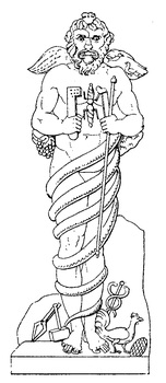 Исток Нила, символически изображенный в виде бога Хапи, сидящего в скальной пещере. В руках у Хапи — сосуды с водой. Пещеру охраняет змей, свернувшийся в кольцо.Но однажды произошло чудо. Вода вдруг заплескалась, заколыхалась, и на поверхности появился великий бог Атум. — Я существую! — воскликнул он, и Вселенная содрогнулась от громового голоса, возвестившего начало жизни. — Я сотворю мир! Я сделаю это, ибо мое могущество настолько велико, что я сумел сам себя создать из вод океана! Нет у меня отца и нет матери; я — первый бог во Вселенной, и я сотворю других богов! А вокруг, как и прежде, все было объято непроглядным мраком и мертвенным безмолвием. В океане не было ни одного, даже самого крошечного, клочка суши, куда можно было бы ступить ногами, — все затопляла вода. Мрачная пучина уже клокотала, готовясь поглотить Атума: уже пенился внизу похожий на разинутую пасть чудовища водоворот и неумолимо затягивал бога в свое жерло. Надо было как можно скорей создать землю, хоть какой-нибудь островок. Спасение от гибели было только в этом. С неимоверным усилием Атум оторвался от воды, воспарил над бездной и, воздев руки, произнес волшебное заклинание. В тот же миг раздался оглушительный грохот, и среди пенных брызг из пучины вырос холм Вен-Вен. Атум опустился на холм и стал размышлять, что же ему делать теперь. «Конечно, сперва я создам других богов, — думал он. — Только вот кого именно? Может быть, бога плодородия? Но ведь нет еще земли, на которой выросли бы травы и злаки, и нет людей, которые могли бы посеять зерно и собрать урожай… Лучше я создам ветер. Без ветра этот океан снова замрет и останется навсегда неподвижным. И еще я создам богиню влаги — чтоб воды океана подчинились ей». И Атум создал бога ветра Шу и богиню Тефнут — женщину с головой свирепой львицы. Это была первая божественная пара на земле. Но тут случилась беда. Непроглядный мрак все еще окутывал Вселенную, и в темноте Хаоса Атум потерял своих детей. Сколько он ни звал их, сколько ни кричал, оглашая водную пустыню горестными рыданиями, ответом ему было безмолвие. А это могло означать все что угодно, даже самое худшее. Может быть, Шу и Тефнут заблудились в океане, а может, они погибли в бездне. В отчаянии Атум вырвал свой Глаз и, обращаясь к нему, воскликнул: — Глаз мой! Сделай то, что я тебе скажу. Ступай в океан Нун, разыщи моих детей Шу и Тефнут и верни их мне. Глаз отправился в океан. Атум поднялся на вершину холма Бен-Бен, сел на землю, горестно вздохнул и стал ждать. Медленно текло время, дни проходили за днями, столетия за столетиями. Всюду был мрак, всюду тишина и холод. Потеряв, наконец, надежду вновь увидеть своих детей, Атум закричал: — О горе! Что же мне делать? Мало того, что я навеки потерял своего сына Шу и свою дочь Тефнут, я вдобавок еще лишился Глаза! И бог создал новый Глаз и поместил его в свою пустую глазницу. Но, как только он сделал это, ему почудился шум где-то вдали. Бог насторожился: что это могло быть? Не грозит ли ему какая-нибудь новая, неведомая опасность?.. Он поднялся с земли, повернул голову и напряженно прислушался. Нет, ему не почудилось! С каждой минутой шум становился все громче… кто-то шел к первозданному холму… уже можно было различить голоса… И бог узнал эти голоса — это были голоса его детей! После многолетних поисков Глаз все-таки нашел их в океане и теперь тор
