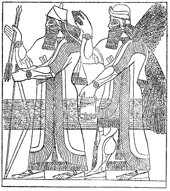 Деталь рельефа из дворца ассирийского царя Санхериба в Ниневии— Дерзкий смертный! — в ярости завопил Ану. — Пусть явится ко мне на суд. Услышав это, Эа обратился к сыну: — Иди, Адапа! Ану во гневе, я могу тебе помочь только советом: растрепи волосы и посыпь их пылью. Облачись в черные одежды. Может быть, явившись с повинной, смягчишь грозное сердце владыки богов. Когда будешь входить в небесные врата, будь повежливей с их стражами Таммузом и Гишзидой. Когда они тебя спросят, почему ты в траур оделся, скажи, что беда на земле — ушли в царство мертвых Таммуз с Гишзидой. Слуги они, но могут за тебя замолвить словечко. И помни: если тебе предложат угощенье — не ешь и не пей! Отвергай и другие дары, чтобы, пищи смерти вкусив, не погибнуть. Поблагодарил Адапа божественного советчика и отправился в дальний путь. Стражи небесных ворот спросили его: — Кто ты? Почему ты явился на небо в одеждах, приличествующих смерти и подземному миру? — Мое имя Адапа. А в трауре я, потому что у нас на земле несчастье — исчезли два бога великих, Таммуз и Гишзида, — отвечал Адапа, как отец его научил, потупив глаза. Переглянулись небесные стражи, и понял Адапа, что удалась его хитрость. Вперед побежали слуги, чтобы возвестить господину о приходе Адапы. — У врат человек появился! — сказали боги Ану. — Его имя Адапа. Он — само благочестье. — Пропустите его! — приказал Ану, смягчившись. Так оказался Адапа перед небесным троном и рассказал владыке обо всем без утайки, как было. — Выходит, что Южный ветер первым затеял ссору, — проговорил Ану, выслушав рассказ рыболова. — Это меняет дело. Что же ты стоишь? Ложись, поспи с дороги! Вспомнил Адапа наставления Эа: «Сон подобен смерти», — и, поклонившись, ответил: — Мне не до сна! — Тогда садись. — Мне ли сидеть в присутствии бога? Адапа все больше и больше нравился владыке небес, и тот предложил ему еду и воду жизни. И на этот раз отказался Адапа, опасаясь отравы. Удивился Ану и спросил: — Кто твой советчик? — Меня наставлял отец мой Эа, — ответил Адапа. — Не на благо пошла тебе его мудрость, — вымолвил Ану с презрением. — Был ты ловцом, им и останешься. Вечную жизнь на крючке удержать не сумел ты. Выпустил в море ее. Не обрел ты бессмертья себе и потомкам. Стражи! Верните на землю его.