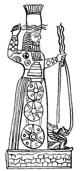 Бог МаррукЦелый ряд богов, почитавшихся в Эбле, совпадал как по аналогичной или близкой форме имен, так и по функциям с богами других западносемитских городов. Среди них уже упоминавшийся Даган, а также бог Грозы Адад (в форме Адда). В функции Адада входило и обеспечиваемое небесными явлениями плодородие. Последние десятилетия Эблы, когда город вошел Бог Мардук в сферу политического и культурного влияния Алеппо, где находился главный центр его почитания, Адад появляется на печатях Эблы в типичной для него иконографии: с жезлом в одной, поднятой руке, топором и уздой — в другой. Сохранилось и его монументальное изображение на стеле, самое древнее из найденных до настоящего времени. С начала II тысячелетия это величайший бог во всех городах Внутренней Сирии, не только ведавший плодородием земель, но и взявший в свои руки правосудие среди богов и людей. Судя по обилию в текстах Эблы имен, содержащих концовку — il, зчительную роль в религии Эблы играл Ил, известный всем семитским религиям (в том числе и как обозначение бога вообще). О глубокой его древности свидетельствуют угаритские мифы, где он выступает как почитаемый, но уже одряхлевший и постепенно оттесняемый более молодыми богами. С сакрализацией царской власти, возможно, связан Малик, после падения Эблы утративший ту значительную роль, какую играл вЭбле. Широко почитался Шамаш, названный по аккадскому шаблону сыном Сина, хотя в пантеоне Эблы присутствует собственное лунное божество. Из наиболее распространенных богов, общих западносемитскому миру, в текстах архива представлены также важнейшее семитское божество Ваал (Баал угаритских текстов середины II тысячелетия), Рашап (или Расап), архаическая форма знакомого по Библии имени Решефа, бога Грозы, загробного мира, смерти и неотделимых от нее войн и эпидемий, бог-ремесленник Кашалу (более поздняя, угаритская форма — Котар), связанный с первозданными водами и мудростью Эа (шумерский Энки), Аштар (Иштар более поздних текстов), почитавшаяся даже после окончательного уничтожения Эблы хеттами в расположенном на той же территории ассирийском святилище как небесная и одновременно хтоническая великая богиня, владычица любви, плодовитости и плодородия, вместе с тем войны и правосудия, а также царственности и первозданного подземного океана.