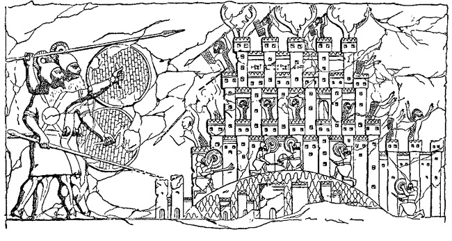 Осада ассирийцами горной крепостиВзяли Ирсирры сына с колен Кумарби, подняли они его, как дар драгоценный, прижали к груди, понесли, на колени к Энлилю положили. Поднял очи Энлиль, на малыша посмотрел. Тело его из камня кункунуцпи[315]. И начал Энлиль душу свою вопрошать: «Кто и откуда этот малыш? Не суждено ли ему вступить в тяжкие битвы с великими богами? Лишь Кумарби мог замыслить такое зло! Он, породивший бога Грозы, породил ему и врага». Только это промолвил Энлиль, как Ирсирры взяли малыша и поставили его на плечо Упеллури, как меч. И начал ребенок расти. Каждый день он вырастал на сажень, каждый месяц — на четверть версты. Уже за пятнадцать дней поднялся Улликумме высоко. Словно меч, он в море стоял, и было оно по пояс ему. Как молот, вздымался тот камень, уже достигая храмов небесных. Бог Солнца взглянул с небес, и увидел он Улликумме, с ним он встретился взглядом. И начал тогда бог Солнца беседу с душою своею: «Кто там в море растет не по дням — по часам, на богов непохожий?» И направился бог Солнца к морю, когда же до моря дошел, руку свою опустил на лицо того, кто к небу вздымался. Твердость камня нащупав, он задрожал от гнева и направился к богу Грозы для объясненья. Увидев его приближенье, прислужник бога Грозы Ташмишу стал так рассуждать перед владыкой своим: — Почему является к нам бог Солнца, властитель великой страны? Наверное, забота его не проста. Нам этим нельзя пренебречь. Ведь если на небе сраженье или мятеж, в нашей стране голод и смерть. — Поставь трон, Ташмишу, чтобы гость наш мог сесть. Стол прикажи накрыть, чтобы насытиться мог. Бог Солнца, явившись, не сел на престол, не притронулся к пище. Дали чашу ему с питьем, не пригубил он ее. Тогда спросил его бог Грозы: