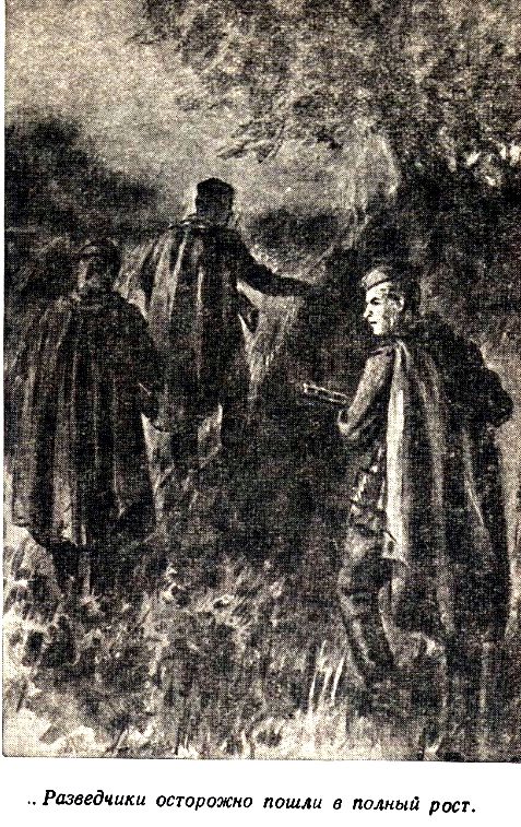 Когда разведчики, миновав свое боевое охранение, вышли на «ничейную» полосу земли, отделявшую советские войска от немцев, была уже темная, безлунная ночь. На иссиня-черном небе ярко мерцали крупные холодные звезды. Роса густо покрывала некошеные, вытянувшиеся выше колен травы. Ночь была не по-летнему прохладная. Редкие невысокие кусты чернели в темноте, как фигуры притаившихся людей. Каждая канава, каждый куст могли таить в себе засаду, могли в любую секунду брызнуть огнем автоматных и пулеметных очередей. Разведчики каждую минуту были готовы ответить ударом на удар врага. Но сегодня бой был не нужен. Наоборот, необходимо было раствориться, исчезнуть в темноте ночи и под ее покровом проникнуть в тыл врага, обмануть бдительность вражеских секретов. Разведчики шли цепочкой, один за другим, быстро, но бесшумно. Казалось, не люди идут по обыкновенной земле, а призрачные тени плывут в воздухе, еле касаясь мокрой, смутно отсвечивающей росой, травы. Вдруг Белов, шедший впереди всех, лег на землю. Его движение мгновенно повторили и остальные. Шесть человек словно внезапно исчезли. Только тихий шорох да еле заметное колыхание травы показывали, что разведчики не лежат на месте, а ползком продвигаются дальше, вперед. Все было тихо. Лишь мрачное уханье совы изредка нарушало тишину ночи. Даже шум дыхания и удары собственного сердца в тревожном безмолвии этой ночи казались громкими. Лейтенант Чернов полз вторым. Впереди, почти у самого своего лица, он различал в темноте подошвы сапог Белова, то правую, то левую по очереди. Сзади слышался едва заметный шорох. Это поспевал Малютка. Лейтенант знал, что замыкающим ползет Нурбаев, готовый в любую минуту применить свое искусство лучшего гранатометчика полка. И, представив себе, как ползет сейчас позади него Нурбаев, Чернов вспомнил и тот случай, который заставил его забрать Нурбаева из стрелковой роты к себе во взвод разведки. Было это месяца три назад. Дивизия, вышибая врага с последних метров родной советской земли, выходила к государственной границе. Шли упорные, изнурительные бои. Однажды на рассвете по полку разнесся слух, что командир отделения Хасыль Нурбаев в ночном бою захватил в плен какого-то крупного немецкого офицера. Пленного допросили на командном пункте полка, но ничего от него не добились. Это был матерый фашист. На допросе он держался нагло и на все вопросы отвечал забористой русской руганью, выговаривая ее с неожиданной для (немца правильностью. Вскоре, впрочем, выяснилось, что, кроме ругательств, он ни одного слова по-русски не знает. - Ну что ж, Нурбаев,- сказал командир полка после допроса.- Придется тебе самому вести эту птицу до генерала, в дивизию. Гляди в оба. Это, брат, зверюга особая. До штаба дивизии Нурбаев доставил пленного благополучно, но здесь у самого входа в блиндаж генерала произошла неожиданная развязка. Когда Нурбаев и пленный остановились у генеральского блиндажа, к ним подошел дивизионный переводчик старший лейтенант Кобзев и заговорил с военнопленным. Посмотреть на фашистского офицера подошли и отдыхавшие неподалеку автоматчики из охраны штадива. Вначале Нурбаев безучастно слушал звуки чужой, непонятной ему речи, но когда пленный стал особенно горячо что-то доказывать переводчику, сержант заинтересовался и, обратившись к офицеру, попросил: - Товарищ гвардии с