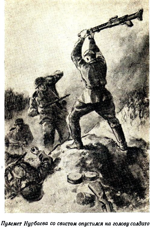 - Нурбаев, ложись! Разведчик плашмя упал на землю. Одновременно навстречу гитлеровцам грянули автоматные очереди. С вершины холма к Нурбаеву бежали автоматчики капитана Розикова. Поднявшись с земли, пошатываясь, Нурбаев вышел на вершину холма. Теперь он понял, почему молчал пулемет Прокудина. Ярко освещенные солнцем, через мост одна за другой мчались тяжелые боевые машины - танки «ИС» - «Сталинцы», как любовно называли их фронтовики. Вместе с Розиковым Нурбаев спустился в дот. Склонившись над Черновым, Розиков, всегда веселый, сразу стал пасмурным. - Зачем так, Гриша,- хриплым и почему-то даже виноватым голосом заговорил капитан, опускаясь на колени подле друга.- Зачем так получилось, Гриша? Всегда хорошо было, на открытом месте хорошо было, а в доте плохо получилось! И лейтенант ответил, видимо, пытаясь улыбнуться: - Какой же это дот? Не дот - халабуда… От одного снаряда раскололся. Где Нурбаев? Где Белов? Живы? Где наши? Все пришли? А Зина?.. Как она?.. - Жив Белов. И Нурбаев жив. Вон ему Прокудин спину ремонтирует. О Зине не беспокойся. У нее рана совсем легкая. Ну, да вы в госпитале, наверное, встретитесь. Сам увидишь. Да ты молчи. Тебе разговаривать сейчас совсем нельзя. Сейчас из санвзвода фельдшера пришлю. Вас в медсанбат только часа через два отправить можно будет. Лежи пока, обязательно лежи.