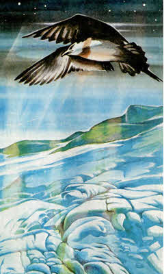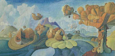 Историки культуры, художники, искусствоведы все увереннее начинают выделять среди традиционных жанров изобразительного искусства особый, «космический жанр». Его часто называют новым, хотя истоки космической темы следует искать в далекой древности человечества. Новый жанр предполагав! редкую свободу формальных поисков, плодотворные эксперименты с цветом, пространством, объемом, перспективой. Он включает в себя не только космонавтику с ее практическим освоением ближнего космоса, но и космическую фантастику, которая стремится в одиночку или в союзе с наукой, литературой «освоить» как можно полнее, «обжить» всю Вселенную. Несколько публикуемых репродукций позволяют почувствовать многообразие эстетических тенденций, существующих в современном космическом искусстве. Так, А. Лопатников обращается к истокам космонавтики, выявляя исторический аспект темы. Его картина «Учитель из Калуги» — своеобразный лирический портрет Циолковского. Для ереванца Р. Гевондяна главным оказывается поиск обобщающего художественного образа нашей космической эры, но в свою работу «Звездный час» он намеренно вводит, подчеркивая связь времен, идущие от средневековья символы трех стихий — водной, земной и воздушной, властелином которых стал человек на своем пути в космос. Иначе тот же замысел раскрывается в динамически устремленной на зрителя графической композиции «Знак землян» А. Веселова. Одну из живописных «метафор» современности Ю. Походаев находит в фигуре космонавта, словно эмбрион будущей космической цивилизации плывущего в неведомых бескрайних пространствах на полотне «В открытом космосе». Другая его работа — «Огненный мир» — вводи! зрителя уже в иное измерение темы, характерное для космической фантастики — в воображаемые области инопланетного и галактического пейзажей. Многокрасочность, неожиданные зрительные или смысловые эффекты, парадоксальность эстетических решений позволяют сторонникам «чистой» фантастики в искусстве — В. Глухову и И. Недбайло — продемонстрировать поистине бескрайние возможности художественного воображения. Полагаясь лишь на собственную интуицию и захватывающую привлекательность создаваемых вымышленных миров, они вдохновенно и убежденно «отрицают» науку. Правда, автор полотна «Красные скалы» исходит еще из вполне понятных образов экзотического земного пейзажа, зато «летающие сады» другого оказываются целиком сказочными. Среди художников космической темы есть и такие, для кого полет воображения или реальный полет в космос не имеют смысла сами по себе, для кого важнее оказывается сюжет «возвращения» из самых далеких и увлекательных путешествий. На картине казахского мастера К. Муллашева «Утро» запечатлен этот момент: появление в небе над родными степями спускаемого космического аппарата. Есть глубокий символ в таком восприятии темы — и каждый полет за ее пределы должен завершиться возвращением человека в наш общий «голубой дом», в материнские объятия планеты.