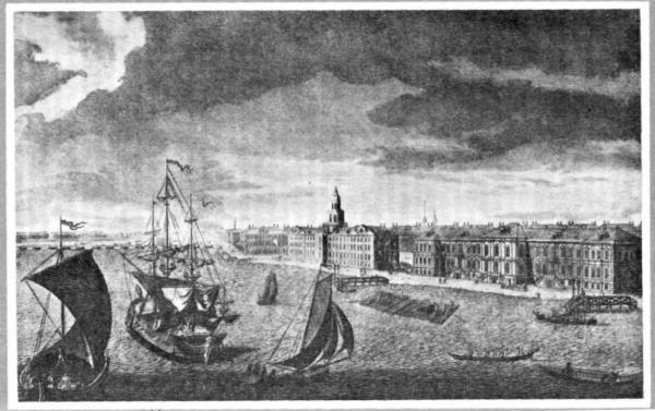 Левую (от зрителя) и центральную часть гравюры занимает изображение очень длинного, как бы состоящего из двенадцати приставленных друг к другу домов «каменного строения под коллегии» на Васильевском острове (см. § 9). Перед «коллежским строением» — неоконченный канал, выходящий из Большой Невы, с двумя мостами через него. В правой части гравюры виден «каменный Гостиный двор на Васильевском острову, на Малой Неве, а из-за Гостиного двора поднимается лес мачт стоящих в Малой Неве «купеческих кораблей» (см. § 10). На площади, образовавшейся между «строением под коллегии» и Гостиным двором, изображен окруженный людьми столб с небольшим куполообразным навесом (на столбе вывешивались для обнародования правительственные распоряжения). В перестроенном виде «строение под коллегии» и небольшая часть Гостиного двора сохранились до наших дней.