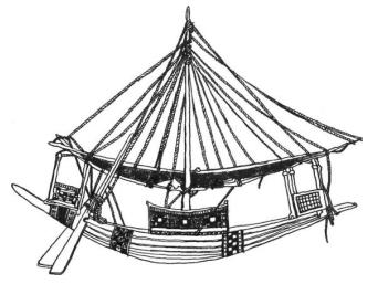 Таким образом, здесь все было «наоборот»: не каркас обшивался досками, а доски поддерживались отдаленным подобием каркаса. Верхние ряды досок обоих бортов, кроме того, скреплялись вместо бимсов банками для гребцов, а поверх устанавливались плетеные релинги, предохранявшие от падения за борт, защищавшие борта от трения при волнении и служившие дополнительными продольными креплениями судна. В носу и в корме настилались полупалубы (очевидно, здесь борта соединялись брусьями - бимсами) и ставилась каюта из амбеча, камыша, папируса или другого легкого материала. Высоко поднятые штевни, украшенные резными изображениями лотоса, рыбок, баранов (символов Амона) или иных священных животных, придавали судну сходство с лебедем. Возможно, это была заимствованная раннефиникийская конструкция, но нельзя исключать и того, что она отражает общую «идеологию эпохи».