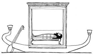 Родственный тип этих судов - погребальные ладьи - в значительной степени копировали барки Амона. В Берлине хранится деревянная модель длиной восемьдесят семь и шириной семнадцать сантиметров, найденная в гробнице управляющего имениями Ментухотпа. Вместо беседки Амона в центре ее палубы стоит ложе под балдахином, куда укладывалась мумия. Ее вел к блаженным полям Иалу кормчий (гребцов здесь также нет, ибо ее, как и «солнечную ладью», направляло течение Нила), прислушивавшийся к крикам лоцмана (он изображен стоящим на носу корабля). Остальной «экипаж» составляли богини и жрецы. Модель ярко раскрашена; вероятно, так раскрашивались и настоящие барки. Возможно, что и дерево для подобных моделей использовалось то же, что и для самих барок. «Солнечные» и погребальные ладьи удивительно напоминают венецианские гондолы.