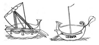 Ранние корбиты были приземистыми и небольшими, однако после реконструкции Остийской гавани Клавдием их габариты сильно возросли. К большим транспортным или торговым судам принадлежали также кибеи, но они известны только по названию, встречающемуся у Цицерона. Немногим больше мы знаем о каудикариях - больших челнах, сколоченных из грубо оструганных досок. Из-за своих размеров эти челны удостоились эпитета navis, и возможно, что по созвучию названия с каудиком их относили даже к лембам. Да и район плавания был сходным: каудики бороздили воды Мозеля, каудикарии - Тибра. Но если каудик был долбленкой-долгожительницей, то каудикарий - «судном одного рейса»: он не мог ходить против течения из-за скверной управляемости при сопротивлении воды, и когда прибывал к месту назначения вниз по реке - безжалостно уничтожался, разом окупив произведенные на него затраты (по этому принципу американцы строили свои «либерти» во время второй мировой войны). Скорее его можно сблизить с понтоном - большим плоскодонным судном галлов, служившим у римлян для переправы людей и скота через реки и известным по изображению в фамильной гробнице Назонов.