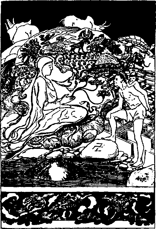 Дети давали представление. Все, что они могли вспомнить из шекспировского «Сна в летнюю ночь», Ден и Уна решили сыграть перед тремя коровами. Отец этих юных артистов сделал маленькую пьесу из большой, и дети репетировали ее, пока, наконец, не выучили наизусть. Комедия начиналась с того места, где Ник-Основа, ткач, выходит из кустов с ослиной головой на плечах и видит сияющую Титанию, королеву фей. За этим следовал скачок к строчкам, в которых Основа просит трех маленьких фей почесать ему голову и принести меду; заканчивалось представление тем, что осел засыпал в объятиях Титании. Ден играл Пека и Ника; исполнял также роли трех фей. Играя Пека, он надевал суконный колпак с двумя ушками, а для роли Основы — бумажную ослиную голову из рождественской хлопушки; только вот беда: при малейшей неосторожности она рвалась. Уна была Титанией в венке из цветов водосбора и с волшебным жезлом в виде цветущего стебля наперстянки. Театр находился на лугу, называвшемся Длинной Лощиной. Небольшая речка, которая, пробежав еще через два-три луга, вертела колеса мельницы, делала на Длинной Лощине крутой поворот, и в самой середине образованного ею мыса было странное волшебное кольцо из темной травы; оно-то и служило сценой. Посреди ивовых кустов, орешин и дикого шиповника, покрывавших берега мельничной речки, было очень удобно ждать своего выхода на сцену. Один взрослый, видевший детское представление, сказал, что сам Шекспир не мог бы придумать более подходящей обстановки для своего произведения. Понятно, родители не позволили детям сыграть комедию ночью, но они пошли на луг после чая, когда тени уже сильно удлинились. Ден и Уна захватили с собой ужин — крутые яйца, бисквиты Оливера и соль в бумажке. Трех коров подоили; они щипали траву с таким звуком, что его можно было слышать на всем лугу; дальше на речке работала мельница; там что-то стучало и шлепало, точно босые ноги, бежавшие по твердой земле. На столбе подле ворот в усадьбу сидела кукушка и пела свою прерывчатую июньскую песню: «Куку-кук», — а хлопотливый зимородок то и дело перелетал от речки к соседнему ручью, который журчал с другой стороны луга. Кроме этих звуков, ничего не было слышно; стояла глубокая, как бы сонливая тишина, и в неподвижном воздухе висел сладкий запах травы и сена. Представление шло прекрасно. Ден помнил все свои роли — Пека, Основы и трех фей; Уна не забыла ни одного слова Титании; даже не сбилась в том трудном месте, где королева фей просит своих трех подданных накормить Основу-ослика абрикосами, свежими винными ягодами и разными там вещами, рифмующимися с первой строчкой. Дети остались так довольны представлением, что три раза сыграли всю пьесу с самого начала до самого конца; наконец, они уселись в середине травянистого кольца там, где не было сорных трав, принялись есть яйца и закусывать их бисквитами Оливера. Вдруг между ольховыми кустами послышался свист; дети быстро вскочили. Чаща кустов раздвинулась, и на том месте, где еще так недавно стоял Ден, ожидая своего выхода в роли Пека, они увидели коричневого человека с широкими плечами, с остроконечными ушами, с коротким расплющенным носиком и со щелочками вместо глаз. Человечек улыбнулся во все свое веснушчатое лицо. Он прикрывал рукой глаза, точно наблюдая за Основой, Буравом, Дудкой, Заморышем и за другими, игравшими пьесу «