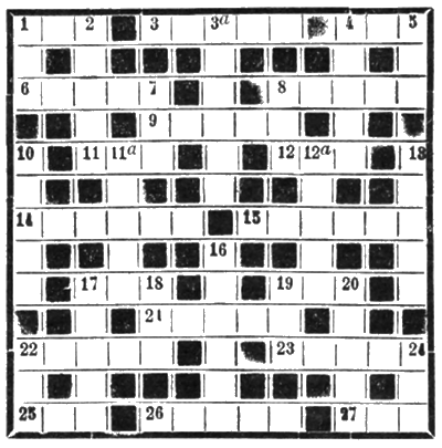 В клетках данной фигуры предлагается расставить буквы русской азбуки так, чтобы получились слова: по горизонтальным рядам: 1) Род лодки, 2) Что всегда можно видеть у горящего костра, 4) Постройка, 6) Недовольство, 8) Житель Малой Азии, 9) Одно из званий в царской армии, 11) Речное животное, 12) Представитель вымершего Ю.-Американского племени, 14) Маленькое водяное животное, 15) Род химической посуды, 17) Род подсвечника, 19) Сорт сыра, 21) Напиток, 22) Река Германии, 23) Плотничий инструмент, 25) Полезное растение, 26) Хищная рыба, 27) Полезное растение. По вертикальным рядам: 1) Житель Трансвааля, 2) Плотничий инструмент, За) Игра, 4) Глупый человек, 5) Цветок, 7) Род упаковки, 8) Число, 10) Металлом ч, 11 а) Создатель произведения, 12 а) Река в Африке, 13) Горный хребет, 16) Соврем. танец, 17) Дикое животное, 18) Земельная мера, 19) Часть тела, 20) То, к чему мы все стремимся, 22) Домашнее животное, 24) Род судебного прошения.