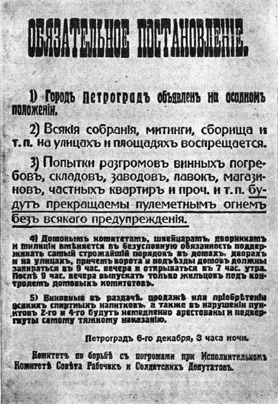 Стремясь одурманить народ, буржуазия решила использовать в качестве своего союзника алкоголь. В городе имелось много винных погребов, оказавшихся куда опаснее пороховых. Алкоголь, затуманив людям мозги, должен был привести к хаосу в городе. Преследуя именно такую цель, буржуазия открыла погреба, приглашая всех пить вволю. С бутылками в руках из погребов выползали пьяные, тут же падали в снег или, качаясь из стороны в сторону, разбредались по улицам, открывая стрельбу и грабя прохожих. Чтобы покончить с этими погромами, большевики пустили в ход пулеметы, расстреливая бутылки со спиртным — бить их иным путем не было времени. В подвалах Зимнего дворца уничтожили вина на 3 миллиона рублей, причем некоторые из хранившихся там сортов были столетней давности. Спиртное вытекло из погребов, но не через глотки царя и его приспешников, а через пожарные шланги в канал. Убыток чудовищный. Большевики глубоко сожалели о нем, поскольку нуждались в деньгах. Но еще больше им нужен был порядок. — Граждане, — заявляли они, — никаких нарушений революционного порядка! Никаких краж и грабежей! По примеру Парижской коммуны мы будем уничтожать всех мародеров и зачинщиков беспорядков. В целях ликвидации создавшегося положения повсюду расклеивали следующее объявление: