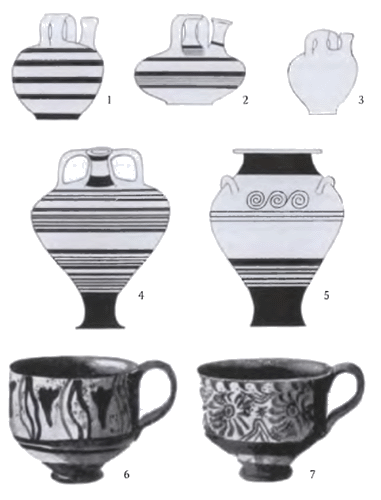Микенское влияние достигло кульминации при Эхнатоне, известном своим пристрастием к чужеземным изделиям. В кучах мусора, выброшенных из дворца, мы нашли 1400 фрагментов микенской керамики, не совпадавших друг с другом и указывавших, вероятно, на половину такого количества ваз и кувшинов. Они относились к глобулярному типу (№ 1–3) и пириформному типу (№ 4–5), что подразумевает торговлю с Кипром и Родосом. В этом они отличаются от керамики из Гароба, которая имеет греческие формы, и, вероятно, продавалась на побережье Африки, в то время как запасы Эхнатона доставлялись с побережья Сирии. Городские отложения Амарны, в сочетании с датированным материалом, ограниченным примерно 50 годами, дают последнее убедительное свидетельство датировки этой древней цивилизации Эгейского региона. То, что вазы были доставлены в более позднее время, представляется невозможным, так как они были перемешаны с 750 фрагментами ценных ваз из разноцветного стекла, несомненно принадлежавших представителям богатых классов. Кроме того, было обнаружено 80 перстней, относящихся к правлению Эхнатона и началу правления его преемника, но ни одного более позднего.