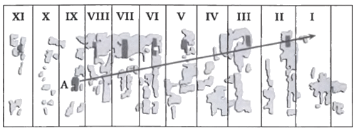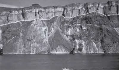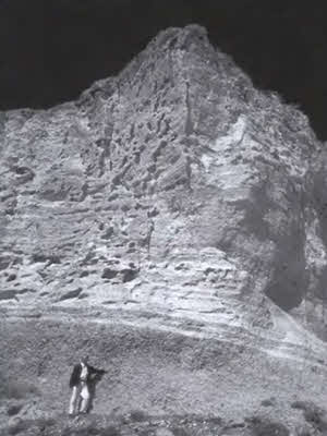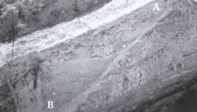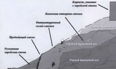 Фотография одной из раскопанных траншей Кеньон в Иерихоне с оштукатуренным гласисом (белая диагональная линия между А и В) с гипсовыми «шипами», вделанными в склон для большей стабильности конструкции. Гласис покрывал склон, ведущий к защитной стене города на вершине холма. В нижней части склона гласис заканчивался опорной стеной с каменной облицовкой.