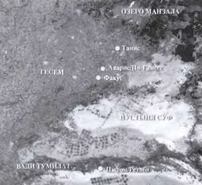 Спутниковая фотография Нильской дельты с указанием расположения Авариса в библейской «земле Гесем» (египетск. Па-Куса, т. е. Восточная дельта) (НАСА).