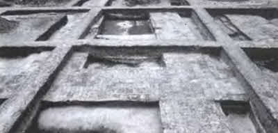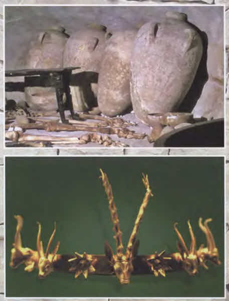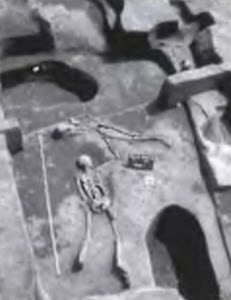 Могила воина-гиксоса из слоя F в Аварисе. На переднем плане находится большая яма с останками принесенного в жертву вьючного животного. Слева от главной камеры находится небольшое отделение, отгороженное стенкой из глиняных кирпичей, где была похоронена девушка-служанка — несомненно, в одно время со своим хозяином. (Фото с разрешения Австрийского археологического института в Каире.)