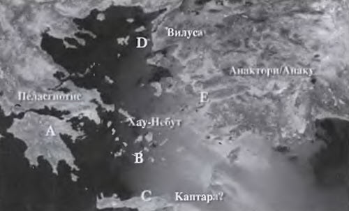 Чужеземцы, говорившие на индоевропейском языке, впервые появляются на исторической сцене как «князья Канеша» в восточной Анатолии, о которых упоминается в текстах эпохи Старого Ассирийского царства из купеческого карума (т. е. рыночного квартала) под цитаделью. Короткий текст, выгравированный на кинжале, который принадлежал Анитте, царю Кушары и Канеша, является первым лингвистическим свидетельством появления индоевропейской аристократии. Эти воины, ездившие на колесницах, основали могучее Хеттское царство, первым правителем которого был легендарный Лабарна (возможно, тот же человек, что и Хаттусили I). Примерно в то же время чужеземцы со сходными этническими и лингвистическими корнями пришли в Грецию из Анатолии или с Балкан и принесли с собой характерную серую минойскую керамику. Этих людей я отождествил с «божественными пеласгами» из греческих легенд, которые впоследствии расселились в континентальной Греции, на островах Эгейского моря (включая Каллисте/Теру) и на западном побережье Анатолии (включая Вилусу/Илион). Эти пришельцы разрушили Трою II, ошибочно принятую Шлиманом за Илион царя Приама, и были далекими предками «народов моря». Вероятно, они говорили на индоевропейском языке, который в хеттских текстах называется лупили и который современные ученые называют лувийским. Некоторые их сородичи мигрировали из Анатолии на Левант, где поселились в начале среднего бронзового века. Впоследствии они построили большие крепости с гласисными валами и стали править коренным ханаанитским/аморитским населением. Независимые индоевропейские царства были основаны вдоль побережья в таких местах, как Угарит и Библ, для морской торговли с Кипром, Критом и прибрежной Анатолией, а также островами Эгейского моря (эти народы были известны под общим названием кафтара/каптор/каптара). За столетия левантийская ветвь этой аристократической элиты постепенно ассимилировалась с ханаанитской культурой региона, а ее представители в следующих поколениях стали брать западносемитские имена — вероятно, в результате перекрестных браков с местными аморрейскими династиями. Воины и полководцы индоевропейского происхождения, вступившие в союз с хурритами из гор Загрос, составляли этническое меньшинство, но превосходили местное население в технологическом отношении со своими навыками разведения лошадей и грозными боевыми колесницами. Вскоре они стали господствовать в регионе. Библейский автор говорит нам, что их вождями были могучие Рефаим и Анаким (анатолийские термины с семитскими окончаниями во множественном числе, означающие просто «предки» и «правители»). Впоследствии Манефон знал их как гиксосов — правителей «пастухов-кочевников» (хека-шосу), так как они были правящей аристократией среди амаликитян, которые занимались скотоводством и вели кочевой образ жизни в пустыне Негев. Он правильно утверждал, что гиксосы пришли из Финикии (т. е. с северного побережья Ханаана), где они сначала поселились в регионе «плодородного полумесяца». Эти северяне, которые утвердили свою власть в Египетской дельте в эпоху гиксосов, называли себя хекау-касут — «правителями чужеземных стран», или, точнее, «правителями горных регионов». Я считаю, что этот термин относится не просто к гористой области вообще, как часто подразумевается в справочных и
