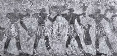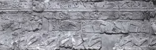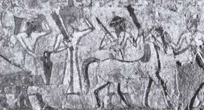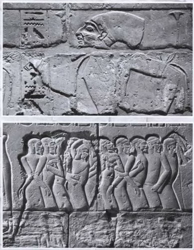 Воины шардана в характерных шлемах; часть сил вторжения «народов моря», изображенных на барельефах Рамсеса III со сценами военной кампании восьмого года его правления.