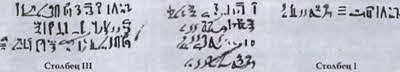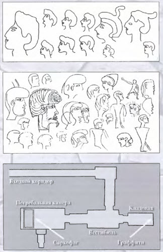 Интересно сравнить профили эгейских лиц с миниатюрной фрески из Западного Дома в Акротири, грубо срисованные мной с крошечных фигурок (справа вверху), с подборкой граффити (справа в середине), обнаруженных на стенах кладовой в пирамиде Сенусерта Ш в Аашуре (план справа внизу). Весьма вероятно, что лица на втором рисунке принадлежали расхитителям гробниц, систематически грабившим пирамиды эпохи Среднего Царства. Их действия не были тайными, поскольку тоннели пробивались в мягком известняке, непосредственно примыкавшем к входным коридорам пирамиды, которые были перекрыты твердыми гранитными блоками после погребения фараона. Граоители просто прорубали параллельный коридор и проникали в пирамиду за гранитным перекрытием. У нас нет возможности точно определить, когда была разграблена пирамида Сенусерта III, но с большой вероятностью это произошло в неспокойные времена Второго Про межуточного периода, когда чужеземцы впервые захватили Нижний а затем и Средний Египет, где находились пирамиды эпохи Среднего Царства. На мой взгляд, профили на обоих рисунках имеют явные черты сходства (особенно начес надо лбом), и лица из Дашура имеют характерные признаки эгейского, а не египетского происхождения Можно ли считать их автопортретами воинов-гиксосов собиравших золото фараонов для своих хозяев в Аварисе?