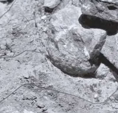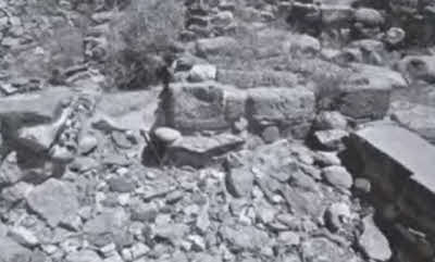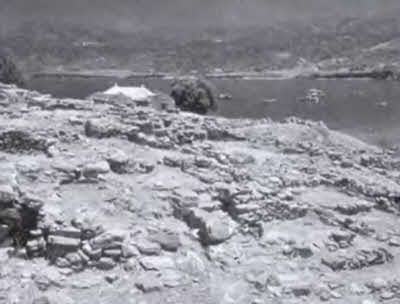Рабочий осторожно удаляет землю с кучки фрагментов эгейской фрески в Эзбет Холми в 1991 г..