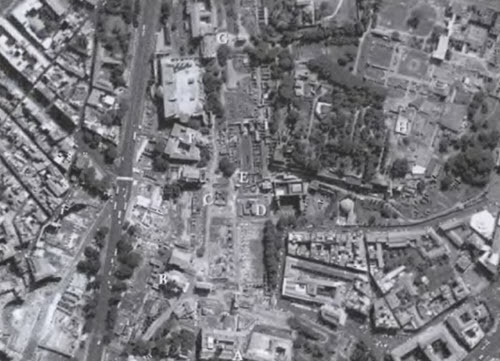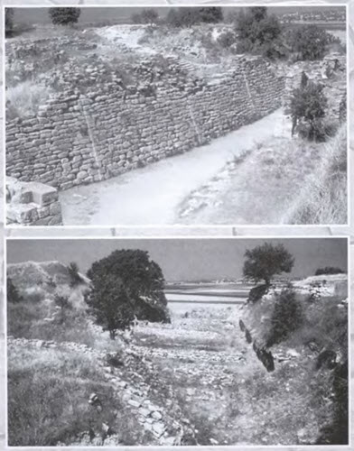 Слева (под белым домом) тянется фундамент крепостной стены гиксосов. Круглые выемки в левых квадратах, примыкающих к стене гиксосов, представляют собой ямы для деревьев и шпалер виноградника. Археологи в правом нижнем квадрате аккуратно очищают фрагменты фрески Внизу справа можно видеть часть свалки, под которой в следующем году была обнаружена дворцовая платформа Хелми I.