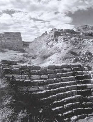 Массивный кирпичный фундамент крепостной стены «больших гиксосов» в слое D/1 и D/2, которая окружала Аварис. Прямой угол в правом нижнем углу фотографии соответствует расположению одного из контрфорсов или башен, встроенных в крепостной вал через регулярные интервалы.