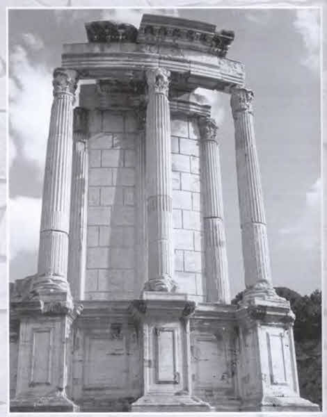Римский форум с тремя сохранившимися колоннами храма Кастора и Поллукса справа и храмом Весты в конце мостовой, за которым на гребне холма видна арка Тита. Круглое здание слева от форума — храм Ромула, а Палатинский холм поднимается с правой стороны.