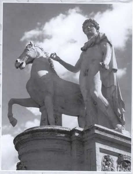 Римская статуя великого конника и полубога Кастора у лестницы, поднимающейся на Капитолийский холм.