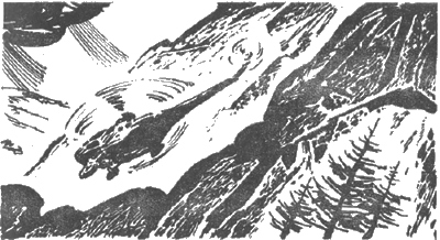 Отдаленный гул, возникнув справа и немедленно повторенный слева, приближался к группе людей, стоящих у подножия скалы. Сначала он казался эхом, пролетевшего на большой скорости реактивного самолета. Затем звук стал дробиться, постукивая неровными ударами морского прибоя о каменистый берег. Приливы нестройного гула сменялись отливами. Казалось, кто-то неумело музицировал на одних басовых нотах, которые то звучали громко, то затихали. — Что-то мне эта музыка не нравится, — проворчал профессор. — Не пора ли восвояси? — обратился он к пилоту. — За один рейс всех не увезти, — сказал тот. — А если попытаться? — Извините, профессор, но вертолет не бабочка, которая может спланировать на каждый цветок. Один кто-то должен остаться. Можно и двоих… А подбросят горючего, тогда все сюда перебазируемся. — Хорошо. Остаюсь я и Дмитрий, — сказал профессор, — а Семен с Игорем полетят. Завтра вы приведете сюда пешком остальных. — Головин нас не послушается, Максим Харитонович, — возразил Игорь. — Лучше вам самому лететь. Обескураженный неудачей юноша готов был до последнего дыхания продолжать поиски водопада. Да и не хотелось встречаться с Сашком, с этим неутомимым пересмешником, который теперь и шагу ему не даст шагнуть без того, чтобы не напомнить об ошибке. — Пожалуй, вы правы, — неожиданно согласился профессор. — Остаются Игорь и Костя. То есть Дима! Максимум осторожности. Ждите нас завтра-послезавтра. Семен, оставь ребятам весь харч и порох.ЧЕЛОВЕК В БЕДЕ