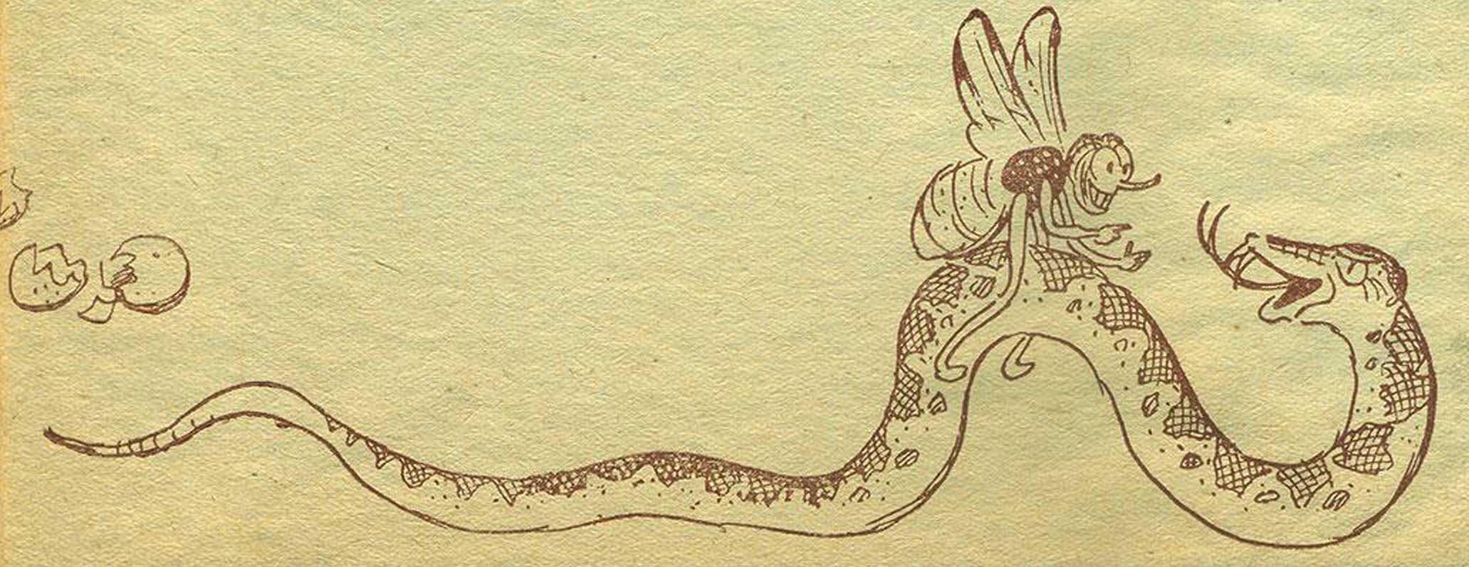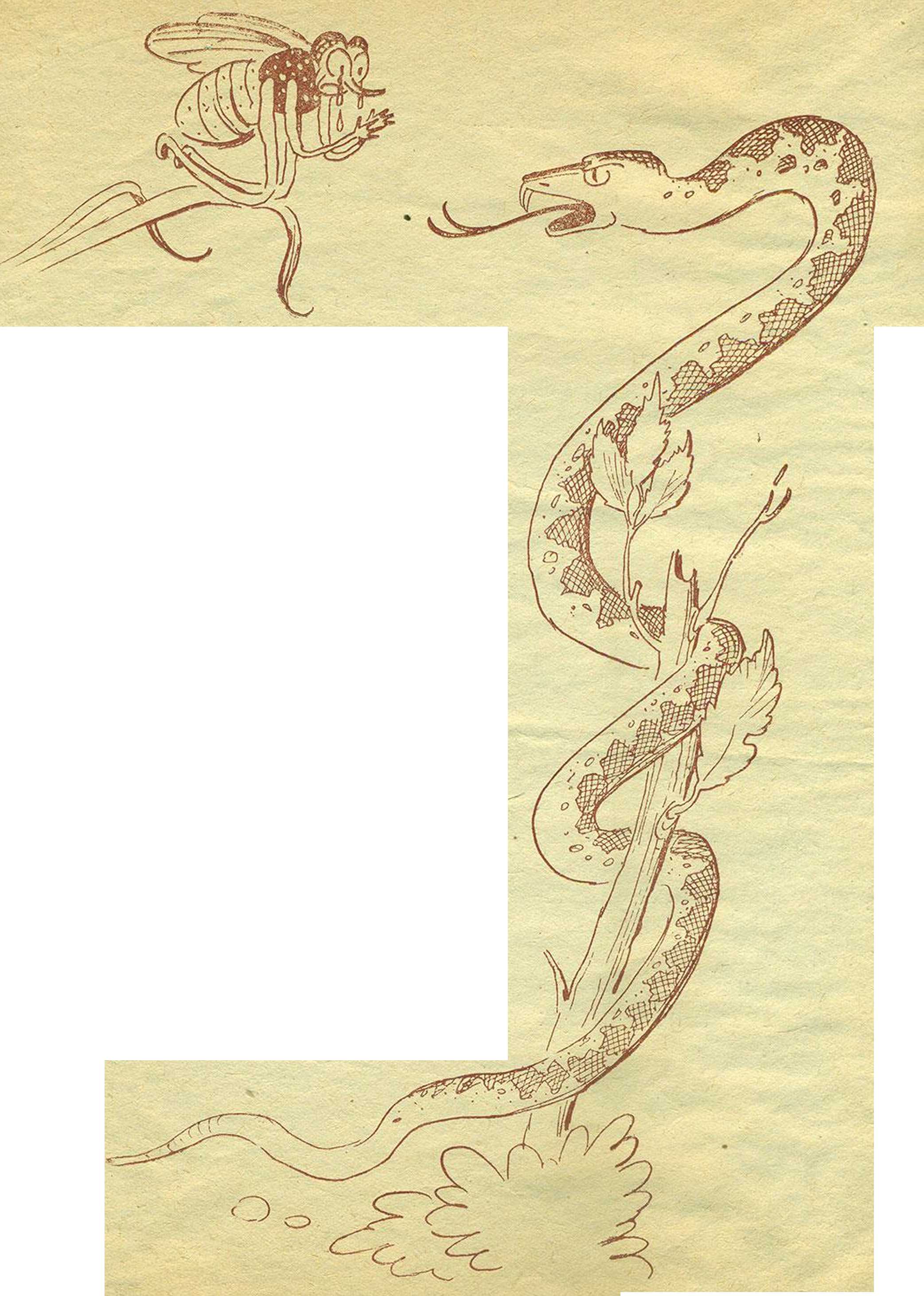 Там же неподалеку жила Змея-Гадюка. Она в это время спала. Комар разбудил ее своим криком. Поползла змея узнать: в чем дело и увидела Муху-Кусуху.
