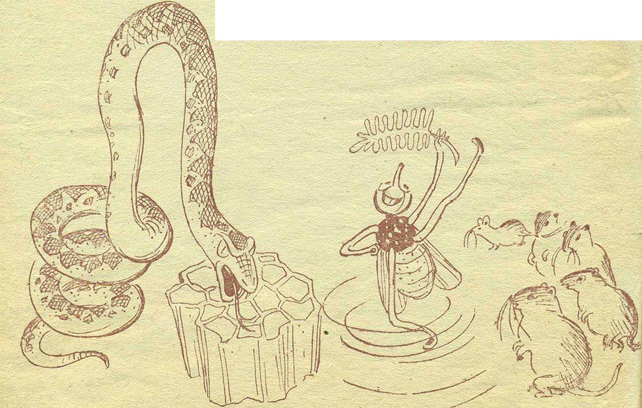Пролетала раз Пчелка мимо гнезда змеиного, видит: Змея мед ест, Муха-Кусуха, сняв передник, танцует, а Мыши сидят вокруг и любуются.