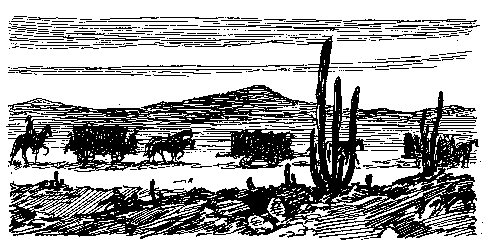Переход в двадцать миль привел небольшой отряд к тому месту, где он должен был дождаться, пока к нему присоединится большой отряд, укрывавшийся в Мескитских горах. Они расположились здесь лагерем, развели костер, изжарили жесткое и невкусное, но сдобренное голодом волчье мясо, - на всем пути, как и предсказывал Рубэ, им не встретилось никакой дичи, - поели его и улеглись спать. Рано утром их разбудил приезд остального отряда охотников, скакавших всю ночь. Так как и у них провизии совсем не осталось, то предоставить утомленным лошадям длительный отдых нечего было и думать; через несколько часов оба соединившихся теперь отряда отправились через Сиеррский лес в надежде найти по другую его сторону дичь. Эта надежда, по воле благосклонной судьбы, не обманула их. В тот же день им удалось найти путь по свежим следам бизонов, и они поохотились так же удачно, как недавно индейцы, - на зависть голодным охотникам, сидевшим в западне, - добыли много сочного бизоньего мяса. Нагрузив свою богатую добычу, они снова отправились в путь, к развалинам старой миссии, находившейся приблизительно в десяти милях от места охоты. Развалин они достигли к вечеру, когда только что закатилось солнце, спугнули своим появлением сов и волков и решили расположиться лагерем среди обрушившихся стен бывшего местопребывания миссионеров. Все чувствовали слабость и истощение от дней голодовки, и потому, едва поужинав и позаботившись о лошадях, они растянулись, положив в изголовье свои седла, и очень скоро уснули. Так как ночь прошла спокойно, то утром можно было заняться нетрудной работой вяленья, или высушивания, мяса, которая потребовала трех дней. Утром четвертого дня приехали двое охотников, остававшихся на Пинноне для наблюдения, и сообщили, что задуманная хитрость вполне удалась. На другой день, после того как отряд ушел и они остались вдвоем, навахо вернулись к ручью и, увидев сигналы с помощью стрел, действительно отправились по дороге на юг, вслед за ранее ушедшими апачами. Это было, по их наблюдениям, все племя Дакомы, в общем около трехсот человек. Охотникам теперь ничего больше не оставалось, как собраться возможно быстрее и продолжать свой путь на север. Через час они были уже на конях и поехали к скалистому берегу Сан-Педро. После целого дня пути они прибыли в пустынную долину Джилы и, переночевав здесь, пришли к вечеру следующего дня к устью реки Сан-Карло, где и нашли новый ночлег. Сегэн решил проехать вверх по течению Сан-Карло миль на сто и потом повернуть на восток, в страну навахо. Прошло еще несколько дней пути на север по стране, привлекавшей внимание путников странными, необычайными очертаниями гор, вершины которых высились то в форме круглых куполов, то в форме зубчатых венцов, иногда даже в форме остроконечных, как шпицы, башен. Местами попадались горы, похожие на колоссальные столы: колоннообразные скалистые глыбы, совсем прямые, поддерживали лежащие на них каменные плиты. В этих причудливых горных очертаниях путникам чудилось что-то живое до такой степени, что они почти не чувствовали унылой пустыни, окружавшей их; а между тем они ехали теперь по пустыннейшей во всем мире стране, на которую никогда еще не ступала нога человека, обутая не в мокасины; это была страна племени иампариков, жалкой вырождающейся краснокожей народности, к которой остальны