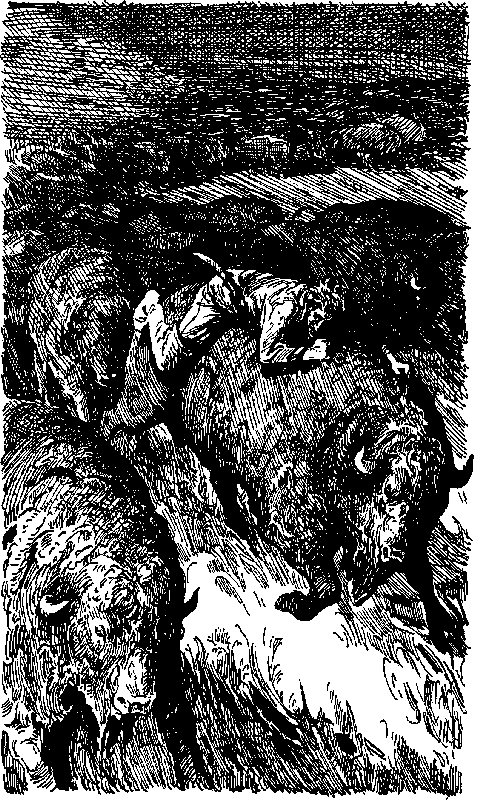 Охотники расположились по приказу своего предводителя между и за голыми скалистыми выступами. Раскаты грома, раздаваясь над самыми их головами, гулким эхом отдавались в мрачном ущелье, и редкие крупные капли еще не вполне разразившегося ливня время от времени падали с шумом на камни. В этой местности грозовой дождь с громом и молниями - явление вообще очень редкое; зато если уж гроза разражается, то она бушует с такой яростью, стихийной силой, которая свойственна только тропическим странам; кажется, что нет и не будет конца дикой, безудержной, разрушительной стихии - пока все не превратится в великий, первобытный хаос. Охотникам видно было, что вдали на востоке буря уже разразилась во всем своем грозном величии и силе. Горы на востоке, из которых брала свое начало та река, на берегу которой они находились, совсем скрылись за нависшими над ними тяжелыми грозовыми тучами - и страшный шум прорвавшегося сквозь их толщу ливня доносился даже сюда. Не могло быть сомнения, что проливной дождь скоро дойдет полосой до ущелья. - Хотелось бы мне знать, что задерживает этих гадов? - сказал, как бы вслух подумав, один из охотников. Про себя это думали все: времени, действительно, прошло достаточно, преследователи уже могли прийти; промедление было неожиданно и непонятно. - Бог знает, что за причина, - отозвался другой. - Может быть, они хотят прежде заново выкрасить город. - Да, я думаю, этим ливнем живо смоет новую окраску, - продолжал шутку третий. Шутки были не особенно остроумны, но беспечность их свидетельствовала о бодром настроении, которое умудрялись охотники сохранить под двойной угрозой со стороны бушующей стихии и неминуемого нападения дикого врага. - Мой вам совет, ребята, - вмешался Гарей, - поглядывайте-ка хорошенько за своим порохом. - Клянусь Богом, его у нас снесет ливнем! - Вот это было бы славно! Ура, приятель! - закричал старый Рубэ, нисколько не заботясь о том, что его может услышать неприятель. - Поплескаться и понырять хочется, старый морж? - Вот именно! - Ну, мне этого не особенно хочется. Почему вам так хочется измокнуть, хотелось бы мне знать? Лихорадку схватить пришла охота? - Часика два шел бы ливень, - продолжал Рубэ, не обратив никакого внимания на последний вопрос, - нам и совсем незачем было бы здесь оставаться!… Вот в чем дело! - Почему так, Рубэ? - спросил насторожившийся Сегэн. - Почему, капитан? - отозвался Рубэ. - Да я видел, как и от небольшого ливня эта речонка так вздувалась, что у вас не явилось бы охоты поплыть по ней… Ура! Ливень будет! Скоро, скоро будет! У Рубэ вырвалось последнее восклицание при виде подвинувшейся с востока огромной черной тучи, насквозь заряженной электричеством; время от времени грохотал могучими раскатами гром, поблескивали сернисто-желтые огоньки молний. Из этой тучи дождь полил уже не каплями, а, как и предсказывал Рубэ, бурным потоком. Охотники закрыли торопливо дула ружей подолами куртки и молча свернулись ничком под ударами ливня. Вдруг, сквозь шум дождя, внимание охотников было привлечено другим звуком. Это был топот копыт по каменистому руслу ущелья - то были лошади надвигающихся навахо. Через несколько минут на одной далекой скалистой глыбе сверкнул при свете молнии какой-то красный предмет; ни у кого из охотников не оставалось сомнения, что это был раскрашенный лоб индейца. Но расстояние, отделявшее и