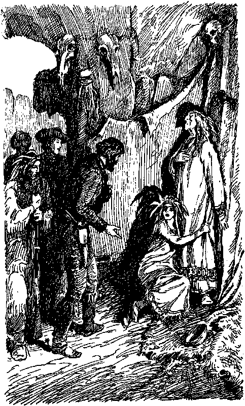 Эта ночь показалась нам бесконечной. Трудно описать наше состояние! Наши часовые забавлялись тем, что садились на распростертые затекшие тела своих пленников и, спокойно покуривая, издевались над нашими стонами. Наши лица были обращены к луне, то прятавшейся за облаками, то появлявшейся вновь. Ветер шелестел листьями, и этот унылый шум казался нам заупокойным пением. Несколько раз где-то вдали начинал выть степной волк. Я знал, что это был Линкольн, но охотник не смел подойти к нам ближе и только давал знать о своем присутствии. Наконец наступило утро. Нас привязали к спинам мулов и повезли куда-то лесом. Мы долго поднимались вверх по крутой тропинке, пока не очутились на вершине скалы, над бездонной пропастью… Там нас сняли с мулов и бросили на траву. Нас окружили человек тридцать харочо, и мы теперь свободно могли рассмотреть их при свете дня. Впрочем, они не выглядели красивее, чем накануне, когда их освещало пламя горевшего ранчо. Командовал этим отрядом Лопес, изо всех сил старавшийся угодить своему начальнику. Очевидно, энергичный падре был тверд в своем слове. Лопес ежеминутно осматривал нас, желая удостовериться, целы ли наши узы. Прошло около получаса, когда мы услыхали топот лошадей. Из-за выступа скалы показался Хараута. Его сопровождали человек пятьдесят харочо. - Buenos dias, caballeros! (Добрый день!) - крикнул Хараута, подъехав к нам и соскакивая на землю. - Хорошо ли провели ночь? Надеюсь, что Лопес устроил вам прекрасные, удобные постели. - Да, капитан! - лаконически подтвердил Лопес. - Так эти сеньоры хорошо спали, Лопес? - Да, капитан! - Никто их не тревожил? - Нет, капитан! - Ну, значит, выспались как следует. Так и нужно; ведь им предстоит очень длинный путь. Так ведь, Лопес? - Да, капитан! - В таком случае они могут отправляться… Вы готовы, сеньоры? - обратился он к нам. Конечно, никто из нас ему не ответил. Да он и не ожидал ответа, а продолжал сыпать вопросами и замечаниями, на которые неизменно следовали односложные ответы Лопеса. Мы все еще не знали, что именно хотят с нами сделать. Что нам предстоит смерть, в этом не было никакого сомнения, но какая - этого мы никак не могли понять. Я думал, что достопочтенному падре угодно будет приказать столкнуть нас в пропасть. Оказалось, что Хараута придумал другое… На краю росло несколько крупных сосен; харочо прикрепили к ним четыре лассо… Мы поняли, что нас хотят повесить над пропастью… - Отлично, - сказал он, когда все нужные приготовления были кончены. - Ставь их теперь на позицию, Лопес, только, смотри, по чинам! Начинай с капитана… - Да, капитан! - ответил невозмутимый разбойник, наблюдавший за операцией. - Вас, сударь, оставляю напоследок, - объявил падре Раулю. - Вы будете в арьергарде при вашем шествии на тот свет. Ха-ха-ха! А хорошо они прогуляются, не правда ли, Лопес, а? - Да, капитан! - Не угодно ли кому-нибудь из вас исповедаться, сеньоры? Я к вашим услугам. Пожалуйста, не стесняйтесь, сеньоры! - продолжал он. - Я не раз имел случай выслушивать исповеди, не так ли, Лопес? - Да, капитан! Разбойники разразились хохотом… - Так что же, Лопес? Никто не желает воспользоваться моими услугами? - Нет, капитан! - Спроси-ка ирландца. Он, должно быть, добрый католик… - Не желаете ли исповедаться? - спросил Лопес у Чэйна. Тот ответил одним взглядом, но таким выразительным, что он заменил целую речь. Хохот раздался еще сильнее. - Чт