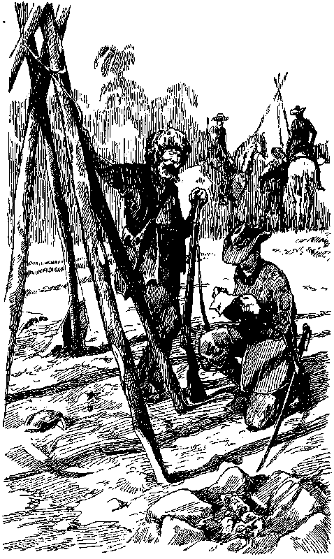 Отъехав шагов двадцать по скалистому обрыву, он увидел внизу поляну и на ней чьи-то силуэты… Быстро подавшись вперед, он дернул Моро за челку - за отсутствием узды он таким способом останавливал лошадь; Моро вмиг остановился, и Галлер с отчаянием вгляделся в грозную группу. Там было две лошади - мустанги - и при них индейцы. Оседланные лошади стояли спокойно на поляне; продетый сквозь кольцо одной из них аркан был обмотан вокруг кисти индейца свободным концом. Индеец - очевидно, второй часовой - сидел на земле, прислонившись спиной к утесу, и по позе его было видно, что он спит. Оружие лежало около него, тоже прислоненное к утесу. Что делать? Убить спящего?… Моро не допустил этого. Обеспокоенный нерешительной остановкою всадника на таком опасном месте, он фыркнул и ударил копытом о скалу. Этого звука было довольно для тонкого слуха индейских лошадей: они тотчас заржали, индеец проснулся - и крик его, а затем и крик его товарища на верхней площадке утеса доказали Галлеру, что оба одновременно заметили его. Галлер увидел, что верхний часовой схватил свою пику и начал быстро спускаться, но внимание его больше привлек другой часовой, схвативший лук и вскочивший с быстротою молнии на спину мустанга, помчавшись с диким криком по поляне вверх, по узкой тропинке навстречу бледнолицему врагу. На бегу он выпустил стрелу, но второпях плохо прицелился, и она просвистела мимо головы Галлера. Через секунду лошади наскочили друг на друга и остановились головой к голове, обе с налитыми кровью глазами; у обеих валил пар из раздувавшихся ноздрей; обе бешено фыркали, как будто сознавая, что и им, как и их всадникам, предстояла борьба не на жизнь, а на смерть - и что одной из двух придется полететь вниз головой с тысячефутовой высоты на каменистое дно ручья, потому что ни разъехаться, ни повернуть назад было некуда. Момент был трагический. В этом положении Галлер не мог воспользоваться своим томагавком, между тем индеец мог пускать в него стрелу за стрелой. Но Галлер не растерялся, а, наоборот, обострившейся при крайней опасности мыслью тотчас решил, как надо действовать, и принялся за осуществление плана. Быстро соскользнув со спины Моро и избегнув этим внезапным движением второй стрелы индейца, Галлер прошел по узкому, как нитка, краю обрыва, тесно прижимаясь к боку коня, и перескочил на выступ скалы, где сидел на мустанге индеец. Мустанг, как будто почувствовав злой умысел, фыркнул в ужасе и хотел подняться на дыбы, но лезвие топора Галлера уже вонзилось в его череп, и через секунду конь полетел в пропасть, увлекая за собой отчаянно пытавшегося отмотать аркан и соскочить индейца. Настала жуткая, зловещая тишина. Галлер мысленно следил за падением, с содроганием рисуя себе каждый фут воздушного пути человека и животного… Вот донесся громкий всплеск… шум падения двух тел в воду… Но предаваться чувствам содрогания или сожаления было некогда: другой часовой вскочил на площадку и, не останавливаясь ни на секунду, побежал на Галлера с протянутой пикой.