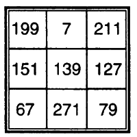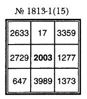 Число в скобках при номере квадрата указывает на длину серии, если сказать иначе — на количество квадратов с «одинаковым центром». Число, стоящее слева от скобок, сообщает о внутреннем порядковом номере квадрата в серии. Серии длины два на множестве публикуемых 20 квадратов обнаруживаются у номеров квадратов 7 и 8 при центральном простом параметре 127, у номеров квадратов 15 и 16 при центральном простом параметре 167 и у номеров квадратов 19 и 20 при центральном простом параметре 191. Просматривая этот начальный фрагмент бесконечного перечня простомагичников, можем отметить такой факт: у простых центральных чисел 2, 3, 5, 7,11,13,17,19, 23, 29, 31, 37,41,43,47 и 53 простомагичных квадратов «нет в природе». Нельзя построить их и для простых центральных чисел 61, 67, 79, 83, 97,101,107,113, 163 и 181. Все 20 девятиклеточников, с 1 по 20, как единый ранжированный и пронумерованный ряд, были впервые опубликованы в совпадающих номерах ежеконцертника «Звоны», начиная с 11 декабря 1996 года по 28 февраля 1998 года включительно. Простомагичный квадрат, приведенный ниже, публикуется впервые и «бежит несколько впереди паровоза». Он напомнит вам о текущем простом и непростом годе (2003 — число простое), о надеждах на счастье и лучшее будущее. Это очередной памятный знак всем о необходимости присутствия гармонии во всем, к чему нам надо стремиться постоянно. Другая магическая таблица призвана напомнить нашим читателям, что «всяк своему счастью кузнец» и что счастье за счет несчастья других — это обман. И недолговечно оно, «блаженство» такое. Прочное и долговечное счастье для всех — тема отдельная и очень сложная. Поэтому о ней обычно думают мало, переадресуют ее кому-то другому, например «ученым мужам», с самого начала объявляют ее фантастикой. Мы же заявляем: думать об этом надо всегда. И кому же еще напоминать о счастье, как ни нам, журналу науки и фантастики?