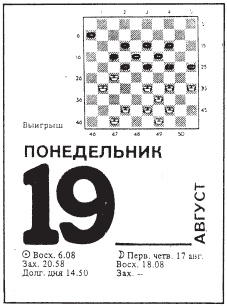 Если вы решили начать новую жизнь с понедельника, сделайте это 19 августа: лучшего дня для любых новых начинаний не найти. Кроме того, в понедельник особый успех сулит разработка нормативных и законодательных актов… И вместе с тем остерегайтесь в этот день рисковать. Из гороскопа, напечатанного в газете «Коммерсантъ», № 33, 1991