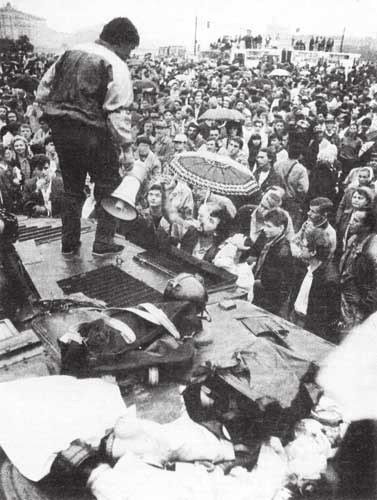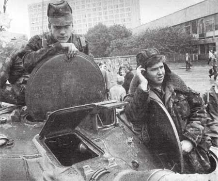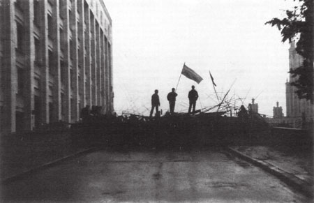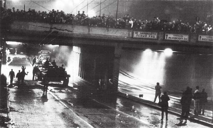 10.20. По сообщению водителей автотранспорта, следующих к центру города, Дмитровское шоссе перекрыто троллейбусами. Блокирующие движение водители троллейбусов выражают свою поддержку и солидарность с Российским правительством. 10.30. Информация от жителей — в районе ярмарки, около «Лужников» — по ночам солдаты стали продавать солярку. Баснословно, кстати, дешево — три бутылки водки за двести литров (бочка). 10.35. На улицах города появились провокаторы, в местах массового скопления людей они агитируют против митингов, демонстраций, обвиняют в пролившейся крови защитников «Белого дома». «Московский комсомолец», 22.08