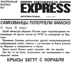 ХРОНИКА СОПРОТИВЛЕНИЯ Ночь и утро 21 августа «Эхо Москвы» продолжало свои передачи. Но в 10.18 подразделение десанта под командованием подполковника Захарова захватило передатчик, по которому вещало «Эхо Москвы», расположенный на улице Демьяна Бедного. «Собеседник», экстренный выпуск № 2
