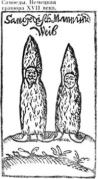Один человек, проживший некоторое время в Пустозерске, рассказал мне об их запряжённых оленями санях, на которых они могут поразительно быстро мчаться по покрытым снегом горам и о которых можно получить представление по прилагаемой гравюре. На ней изображены обычные самоеды, одетые в оленьи меха, волосом вверх, с их оружием — луком и стрелами. Этот человек добавил, что сам видел, как их старосты, или вожди, мчались в таких санях, запряжённых шестью, а то и восемью оленями. Старосты обычно носят красные одежды, спутники же их одеты так, как мы только что описали. Острия стрел самоеды делают не из железа или стали, а из моржовой или другой кости.