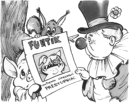 — Конечно, конечно, — заторопился Мокус, роясь в кошельке. Поросенок поднял полученную монетку для всеобщего обозрения. — Вот так, — признался он, — я обманул двадцать семь человек: одиннадцать мальчиков, пятнадцать девочек и одного очень доброго старичка. Дети ведь не знали, что все деньги госпожа Беладонна забирает себе. Я не мог их больше обманывать и убежал! Теперь хозяйка ищет меня повсюду, я — преступник… Такую жизнь хорошей не назовешь! В подтверждение поросенок достал из кармашка полицейский плакат. — «Сбе-жал о-пас-ный преступник по клич-ке Фун-тик, — читал Бамбино, ведя по строчкам кончиком хвоста. — Каж-до-му, кто знает о мес-то-на-хож-де-нии, на-гра-да в сто мо-нет!»