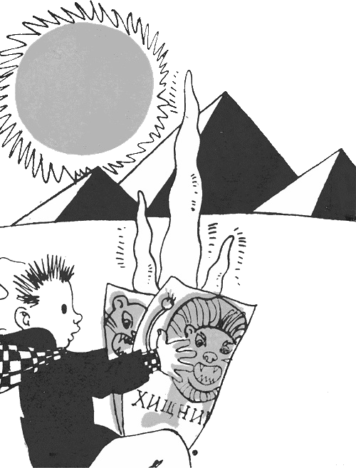 Верблюд поднял голову и лениво обвел взглядом окрестность. Он посмотрел налево, он посмотрел направо, он посмотрел вперед. Везде была пустыня. Далеко-далеко на горизонте врезались в небо черные кубы пирамид. Верблюд оглянулся. Обнаженный по пояс человек жадно пил из фляжки. Верблюд облизал пересохшие губы. Даже ему было жарко. Песок, песок, песок… Он сыплется из-под лопат, хрустит на зубах и сверкает под солнцем миллиардами мельчайших кристалликов. Уже двенадцатый год археологическая экспедиция под руководством действительного члена Люксембургской Академии Наук профессора Хуперта Дю Оза ищет бритвенный прибор фараона Рамзеса Первого. Еще мальчиком профессор, читая в подлиннике древнеегипетские летописи, совершенно случайно наткнулся на описание этого знаменитого прибора, как-то: помазок, две чашечки из берцовой кости единорога — одна для горячей воды, другая для холодной, — бритва-нож из бронзы, секрет изготовления которой ныне утерян, плюс золотой поднос весом в сорок два фунта. «Как же так! — воскликнул профессор, тогда еще мальчик. — Всем известно, что мумия фараона имеет окладистую ассирийскую бороду. И, как установили эксперты, бритва никогда не касалась этой изумительной бороды». В ту же секунду будущий профессор поклялся посвятить свою жизнь археологии, за что его и выпороли родители, которые еще до его рождения наметили ему карьеру банкира и дипломата. Но мальчик не испугался и стал профессором археологии. И вот он уже двенадцатый год безвыездно сидит в пустыне и разыскивает бритвенный прибор Рамзеса Первого, а попутно и древний город, который много тысяч лет назад был погребен под песками. И уже получены результаты, ошеломившие весь научный мир. Найдены: 1. Два волоска из помазка фараона. 2. Осколок чашки для холодной воды. Корреспондент агентства ТАНЮГ задал два вопроса: «Как вы расцениваете результаты ваших поисков? Не помешает ли слава вашей дальнейшей работе?» На первый вопрос профессор скромно ответил: «Грандиозные». На второй: «Можете не волноваться, я не успокоюсь до тех пор, пока не найду поднос». Но не всех потряс профессор Хуперт Дю Оза. Агентство ЮПИ с возмущением спрашивало: «И это вы называете успехом?! За двенадцать лет работы вынуто всего триста тысяч кубометров песка!»Однако правительство Египта благожелательно отнеслось к достигнутым результатам. Именно на этом месте было решено воздвигнуть Асуанскую плотину. Но профессор не упал духом и перекочевал на другой конец пустыни. Диктор объявил: — Вы смотрели новую французскую кинокомедию «Хуперт в пустыне». Лешка Скворешников с глубоким сожалением выключил телевизор. — Ну? — спросил он у Мишки, который сидел в кресле и задумчиво смотрел на погасший экран. Мишка помолчал немного, словно не понимая, о чем его спрашивают, а потом тихо сказал: — Жаль, что нигде поблизости нет пустыни! — А зачем она тебе? — удивился Лешка. — Как зачем? Если бы здесь была пустыня, мы бы с тобой тоже раскопками занялись… — Это верно, — задумчиво произнес Лешка. — Только пустыни здесь нет… — Вот я и говорю, что жаль… Друзья замолчали. За окном наступили легкие летние сумерки. — А ты бы так смог? — вдруг спросил Мишка. — Как? — А вот так, как профессор. Захотел — и стал археологом. — Конечно… А ты? — И я! — Только я не стал бы двенадцать лет искать какой-то дурацкий помазок. — Ср