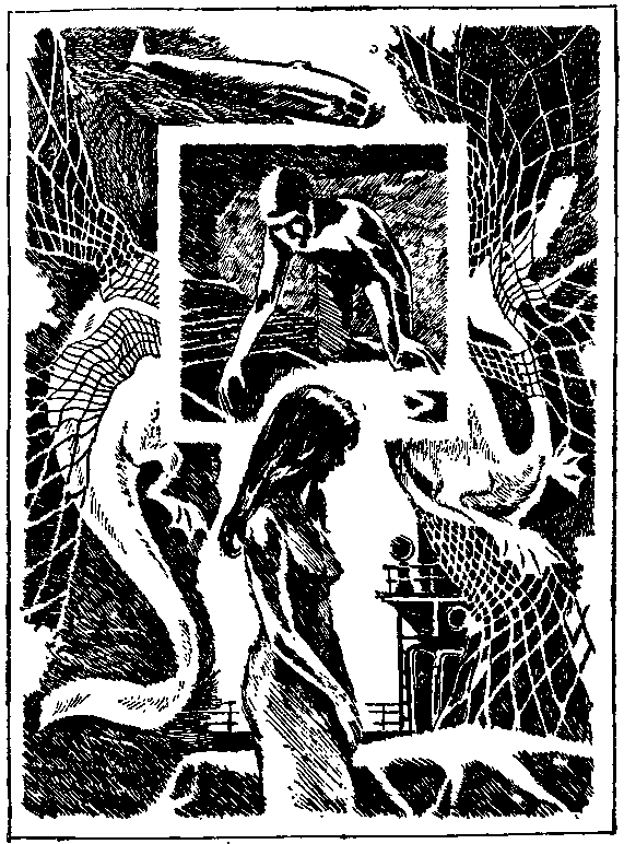 Едва баролифт, закачавшись, стал на дно, Аракелов сравнил показани внешнего и внутреннего манометров. Все в порядке: давление внутри было чуть-чуть выше наружного. Он нажал кнопку замка, и диафрагма люка начала раскрываться. Аракелов был уже наготове: пригнувшись, он оперся руками о закраины горловины, чтобы, едва отверстие достаточно расширится, одним толчком («Трап - для умирающих батиандров», как говаривал старик Пигин) бросить тело вниз, в темноту. И вдруг он понял, что привычной темноты нет. Снизу, из люка шел ровный, холодный, рассеянный свет, и это не был свет прожекторов. Диафрагма раскрылась полностью, и Аракелов увидел уходящие вниз металлические ступеньки трапа. На одной из них сидел… сидело… Нет, не осьминог. И не кальмар тоже. Скорее что-то среднее между ними - ярко-оранжевое бесформенное туловище удобно устроилось на ступеньке. Два огромных круглых глаза в упор смотрели на Аракелова, и в них читалось откровенное ехидство. Восемь ног спускалось вниз, и существо болтало ими в воде - ни дать ни взять мальчишка, сидящий на мостках у реки. А в двух длинных щупальцах был зажат стандартный ротный спаренный лазер образца двадцать первого года. Стволы его смотрели прямо в грудь Аракелову. - Опять струсил? - спросило чудовище, и Аракелов ничуть не удивился - ни тому, что оно говорит, ни тому, что говорит оно голосом Жорки Ставраки. - Нет, - сказал он, спрыгнул в воду и, отведя ствол лазера в сторону, примостился рядом с чудовищем. Ему было весело. - Маска, маска, я теб знаю. - Ну и знай себе. Ведь ты же не пошел… - Я пошел. И сделал. Без меня «Марта» ничего бы не смогла. - Да, - по-свойски подмигнуло существо, и Аракелов впервые удивилс по-настоящему: он никогда не слышал, чтобы спруты мигали. - Да, ты пошел вторым. Вторым уже не страшно… - Я пошел бы и первым. - Бы… Существенная разница. Ты просто испугался, дружок. - Нет. Я боялся, пока не знал. А когда узнал, перестал бояться. Я теб знаю. И не боюсь. Спрут помолчал, играя лазером, потом насмешливо спросил: - А кто тебе поверит? - Поверят, - ответил Аракелов, но прозвучало это у него не слишком уверенно. - А не поверят - плевать. Я-то знаю. - Вот и расскажи это своим там, наверху. Посмотрим, поверят ли они. - Поверят. Потому что знают меня. А я знаю тебя. - Не знаешь. - Чудовище расхохоталось. Смотреть на хохочущий роговой клюв было жутковато. - И никогда не узнаешь. Аракелов заметил, что оно стало как-то странно менять форму, расплываться. Так расплывается чернильное облачко каракатицы. - Знаю. Ты сероводород. И мне на тебя наплевать. - Нет, дружок. Я - пучина. Сегодня я сероводород, ты прав. А завтра? Я сама не знаю, кем и чем буду завтра. Как же можешь знать это ты? - Ничего, - сказал Аракелов. - Теперь я тебя всегда узнаю. Всегда и везде. - Посмотрим, - хихикнуло облачко сепии, окончательно расплываясь, растворяясь в сгустившейся вокруг тьме. - Посмотрим… А пойдешь ли ты еще хоть раз вниз? Разве трусы ходят вниз? И разве их пускают сюда?.. - Пойду! - заорал Аракелов, бросаясь вперед, на голос. - Вот увидишь, пойду! Он сделал мощный рывок, но голова уперлась во что-то холодное, жесткое, и он проснулся. Было совсем темно. Значит, проспал он долго и уже наступила ночь. Он лежал на боку, упираясь лбом в холодный пластик переборки. Хотелось пить. Аракелов повернулся и сел. И тогда увидел, что за столом кто-то сидит. Кто - разобрать было невозможно: из-з