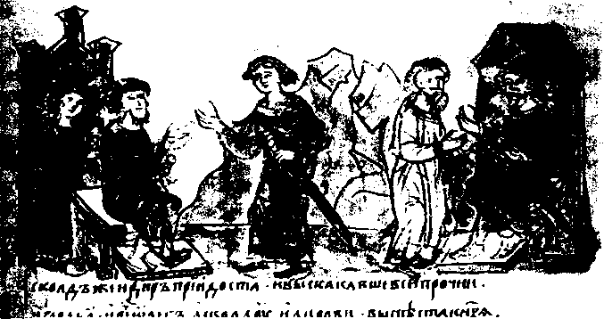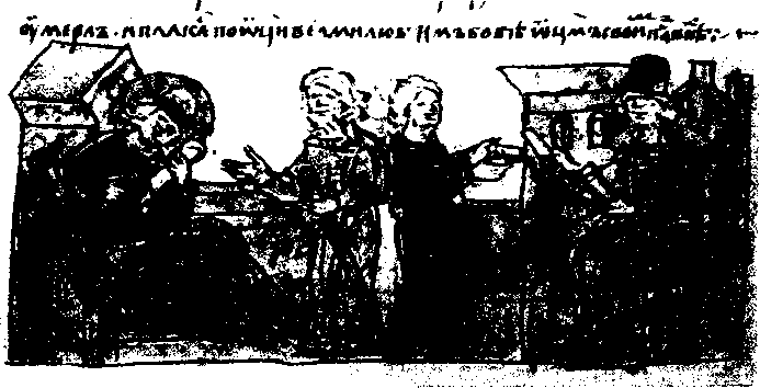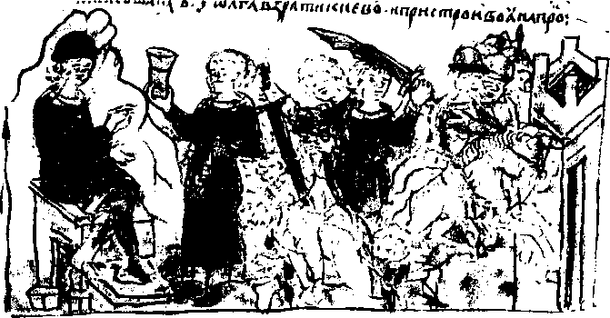 Рис. 7. Третья месть Ольги: угощение древлянских послов вином и расправа с ними